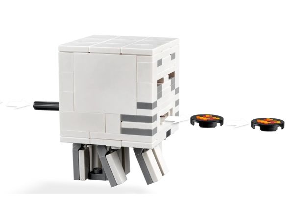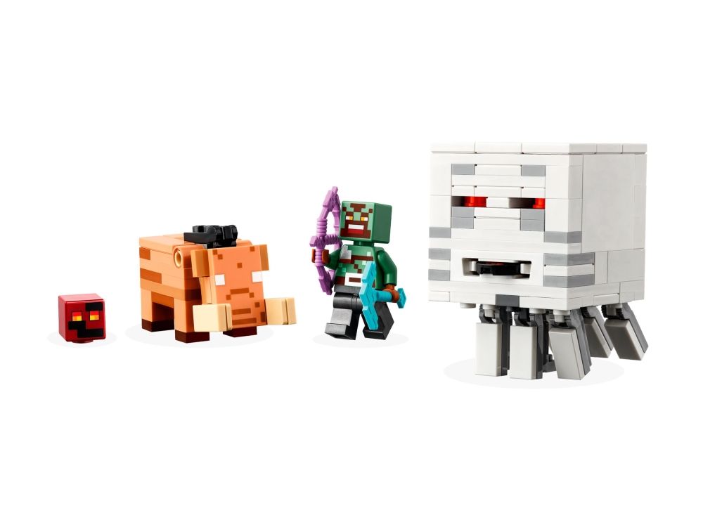 Minecraft® battle scene and action figures – Includes an Orc Warrior figure, a Minecraft ghast that shoots discs from its mouth, a hoglin figure, with its butting head, and 2 magma cubes