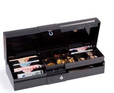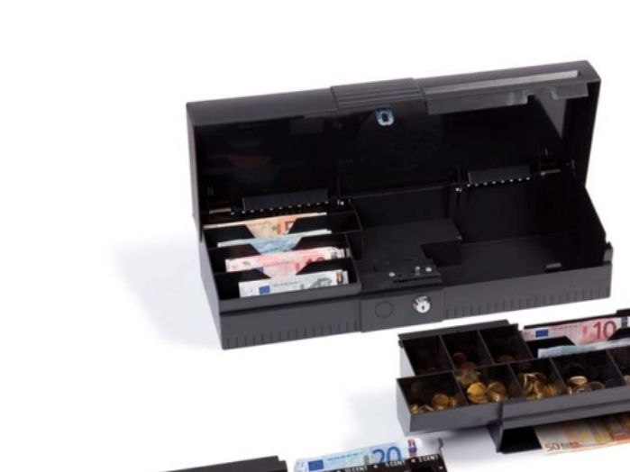 - Electronically opened by the POS system - The lock is shipped with up to 50 different lock combinations - Safety lock available as an optional expansion - The base contains an electronic release unit - Easy removal by pressing the release button - 8 coin and 6 note compartments - Receipt compartment accessible from the outside for easy insertion of receipts