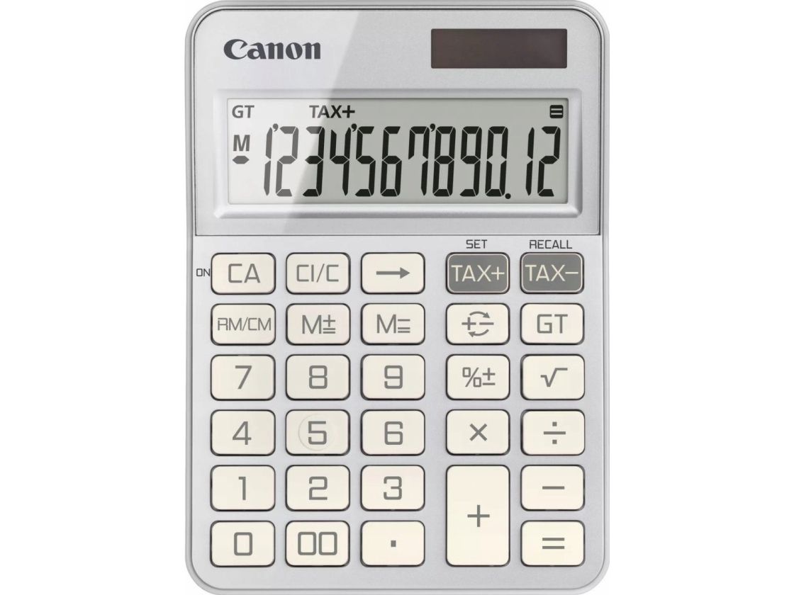 The KS-125KB Calculator is a versatile 12-digit calculator that covers all of your basic functions. The calculator is designed to be convenient, coming with dual power, meaning that it is powered by both a battery and solar power. The calculator offers grand total memory within a slim body and a lifted and tilted monitor, while a choice of colour lets you express your personality. Finally, it is designed using recycled plastic and a plant-based renewably sourced biopolymer called NuPlastiQ, which makes it an eco-friendly choice.Canon KS-125KB. Form factor: Desktop, Type: Basic. Digits: 12 digits. Tax calculation. Power source: Battery/Solar. Product colour: Silver