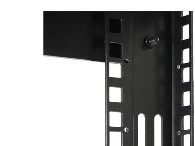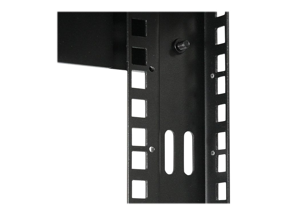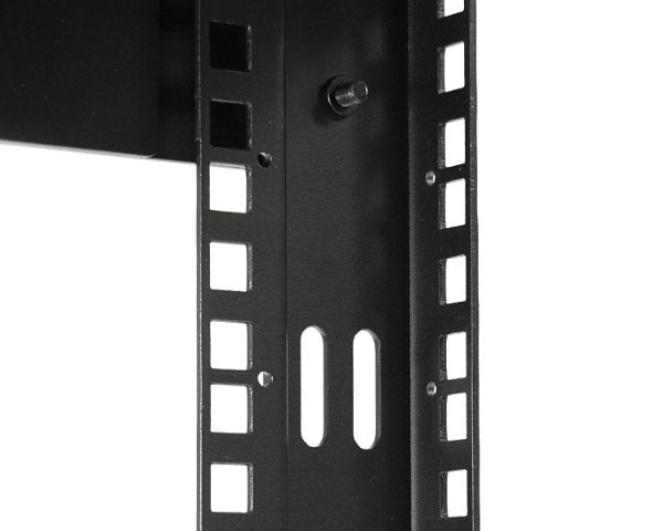 The open rack features an adjustable depth ranging from 12-20 inches, in order to accommodate larger data, network and telecommunications devices. The greater than average depth of the rack also allows for mounting of shelves and other accessories. The wall mounts are positioned 16in apart (center to center), making it suitable for mounting on virtually any wall surface, based on North American wall frame stud spacing standards.