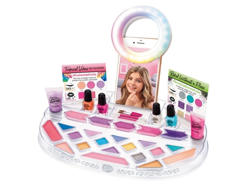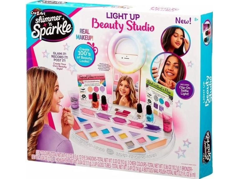 Includes 1 x makeup station 1 x Selfie light for the phone 5 x colors for the lips 12 x eyeshadow 3 x colors for the cheeks 1 x bronzer 1 x highlighter 2 x lip gloss 4 x nail polishes 3 x makeup applicators 2 x mini brushes 1 x makeup guide 1 x "Glam Gossip" card 1 x product stickers 1 x instructions Age 8+