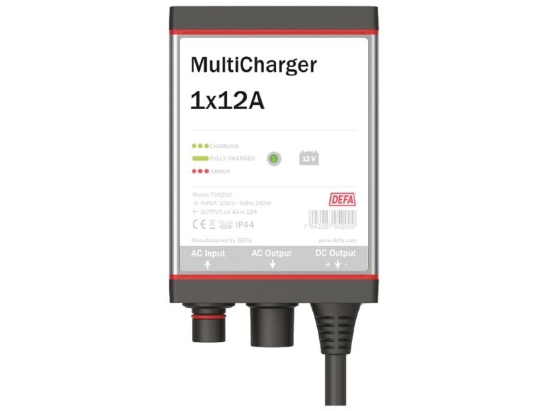 DEFA MultiCharger 1x12A er bygget på moderne switchmode-teknologi og galvanisk isolation. Laderne repræsenterer den nyeste teknologi inden for batterilading, noget som vil give batterierne optimal levetid. Den er velegnet til batteristørrelser op til ca. 150Ah og kan vedligeholdslade batteriet i ubegrænset tid. Laderen tåler parallel belastning op til 6A pr. kanal fra andet forbrug, samtidig med den lader batteriene. Ladespændingen er temperaturkompenseret med udvendig føler. Multicharger erstatter tidligere Marine- og Rescue Charger. Specifikationer: