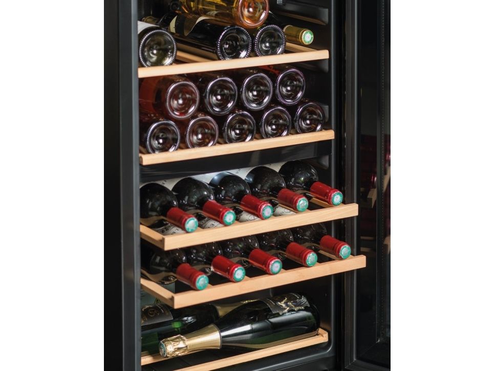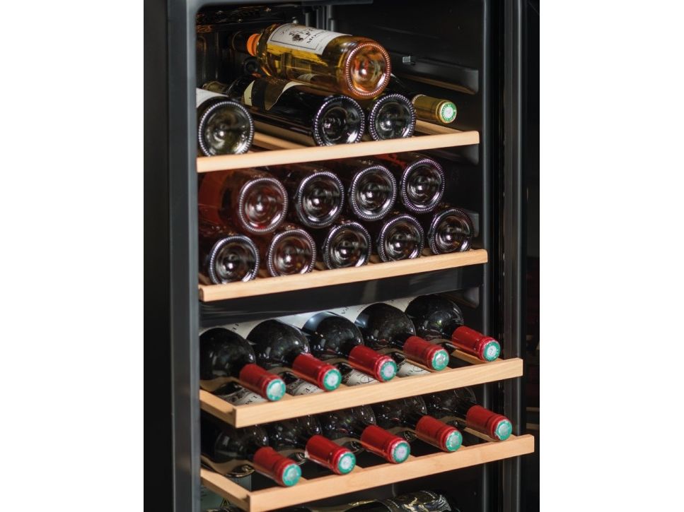 The specified bottle capacity is calculated with a Bordeaux bottle as standard and without shelves in the cabinet. That means that the actual number of bottles that the cabinet can hold, with shelves fitted, will be less than the quantity stated in the product specifications