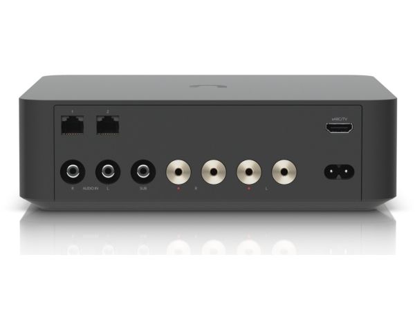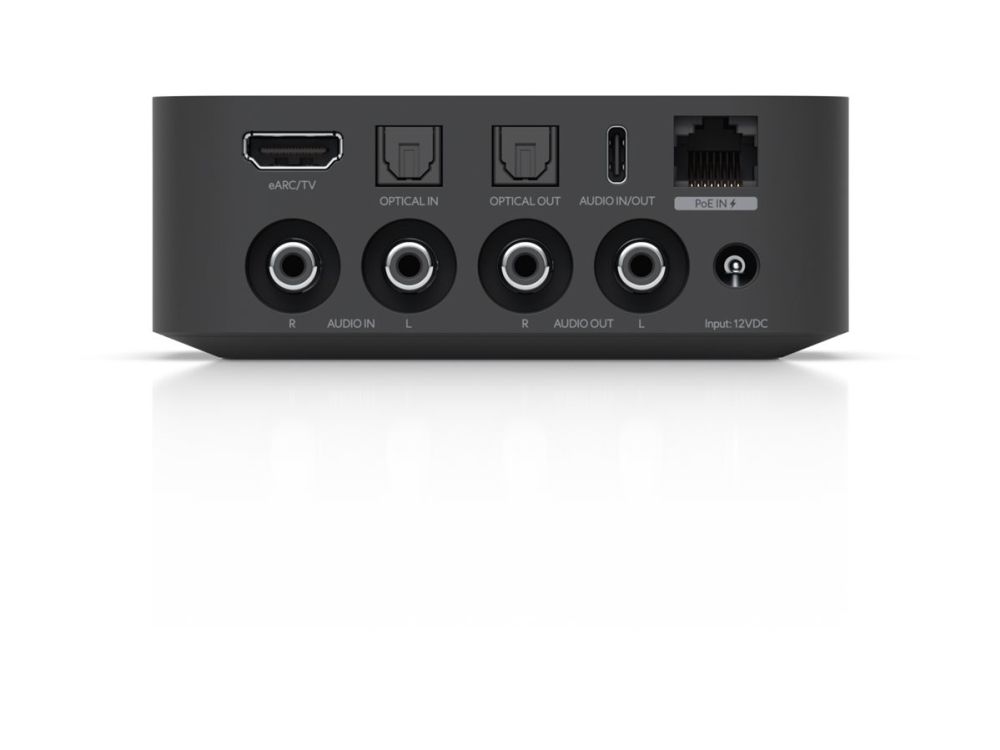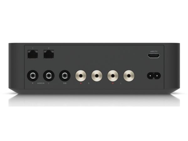 Audioinput (venstre) (RCA) - bagside Audioinput (højre) (RCA) - bagside Subwoofer-udgang (RCA) - bagside 2 x lydudgang (bananstik x 2) - bagside 2 x netværk (RJ-45) - bagside HDMI-eARC (19-pin HDMI, type A) - bagside