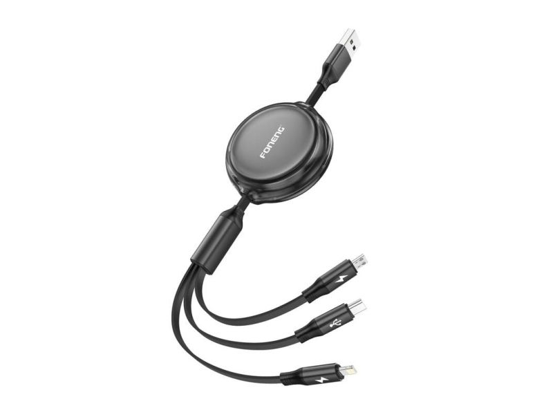 The 3-in-1 Foneng X113 cable combines functionality with modern design. Thanks to its telescopic design with adjustment in several levels, this cable becomes an indispensable accessory for charging Android and Apple devices. With a length of 1.1 meters and a flexible material, it is convenient to use in a variety of conditions, and its unique design makes it a cable that stands out from the rest.