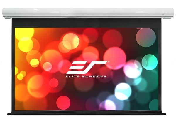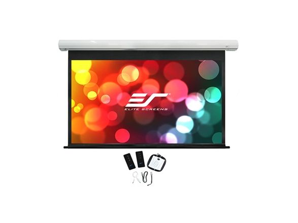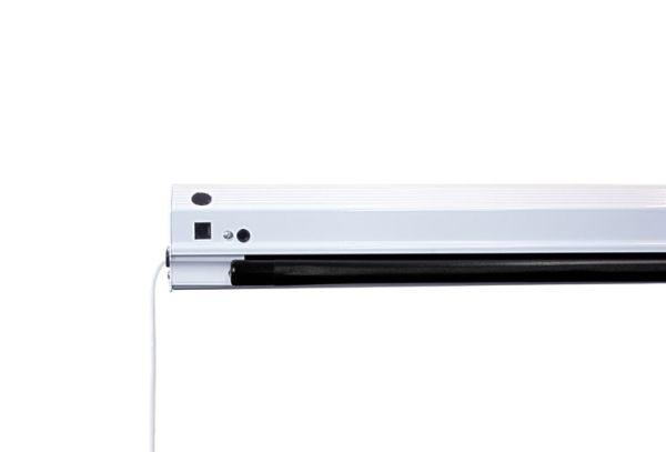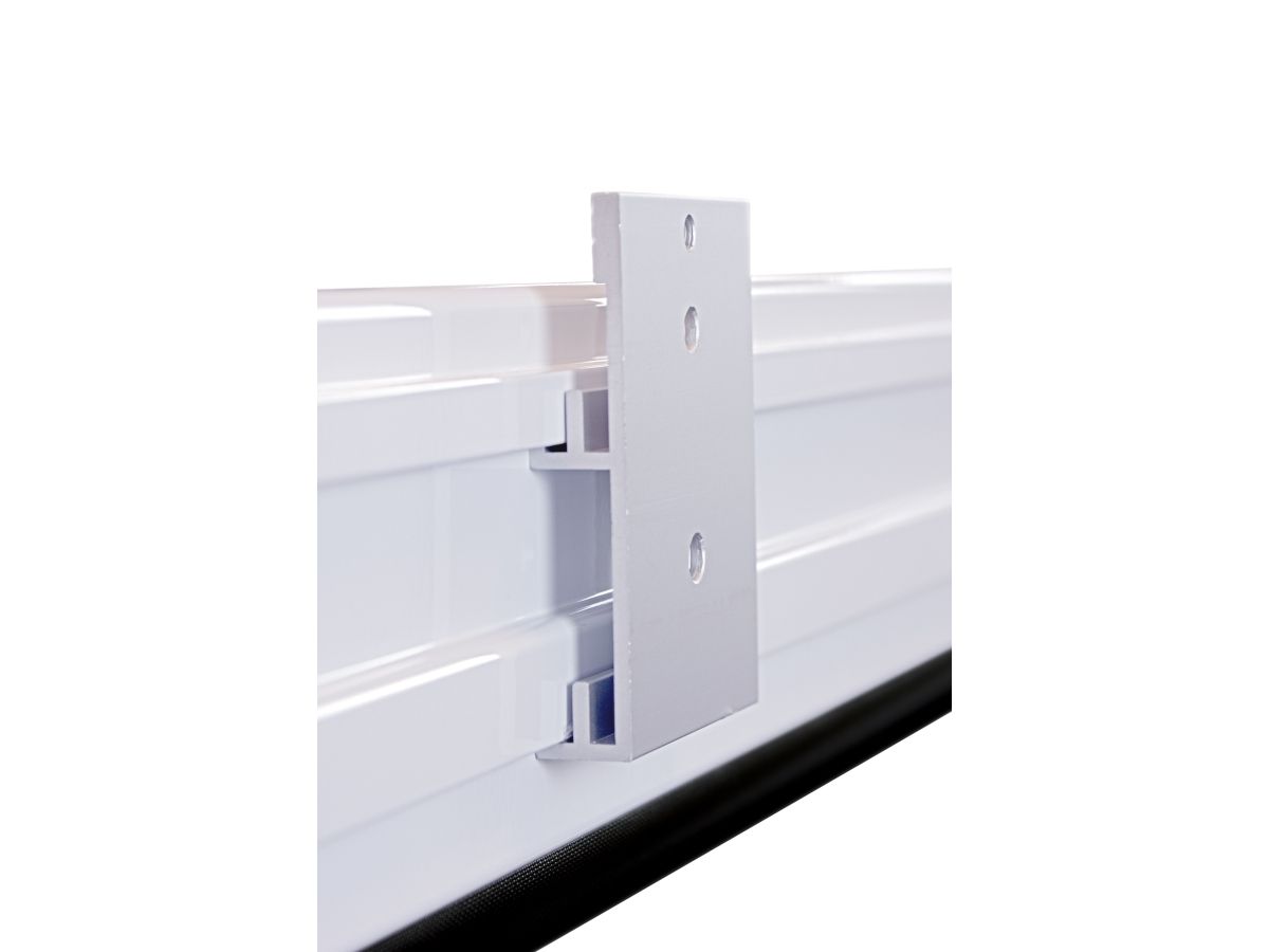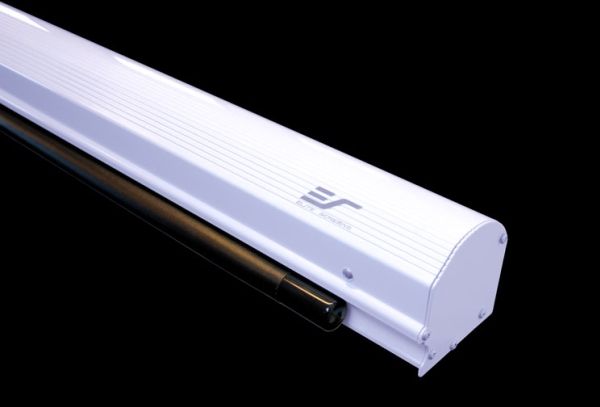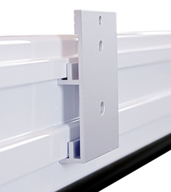 Design and Installation: - Curved aluminum enamel white case with parallel grooves - Mounting hardware kit included for wall or ceiling installation - Extra top black masking border for high ceiling installations - Tab-tension design helps maintain a flat projection surface - Flush hidden wall mounts allow screen to slide horizontally for proper centering - Plug & Play ready, no hardwire installation required