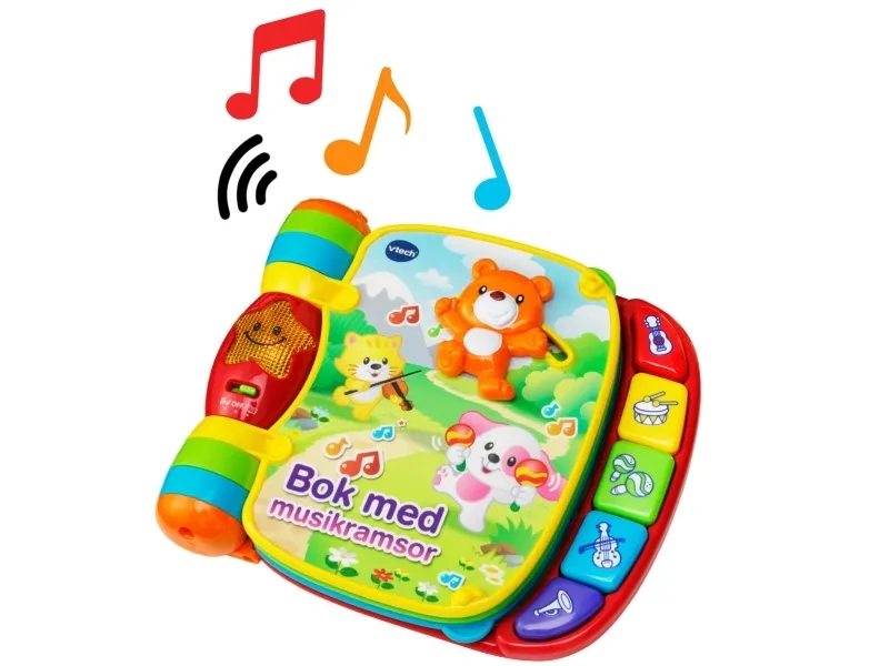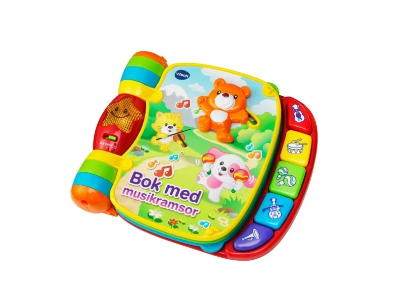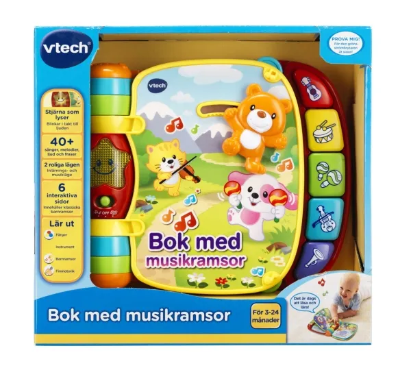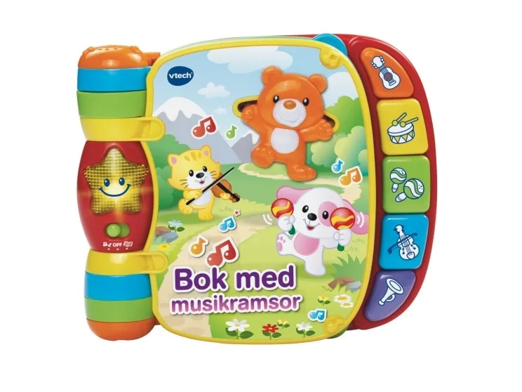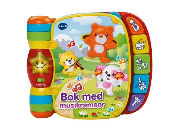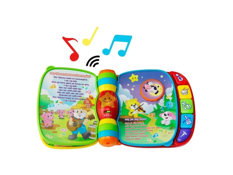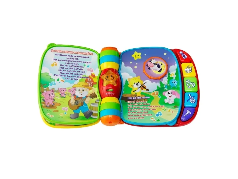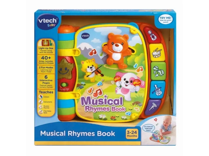 Explore classic nursery rhymes with the Musical Rhymes Book™ by VTech®. Your little one will build motor skills by sliding and twisting the fun play pieces while exploring each easy-to-turn page. Then they'll play piano sounds with the five colorful piano keys that introduce colors and instruments. Two fun modes include learning mode that introduces age-appropriate vocabulary and music mode that plays music and instrument sounds. The interactive storybook provides visual stimulation with brightly colored pages and a light-up star that flashes along with the sounds. Includes 27+ sing-along songs, music, sound effects and fun phrases.