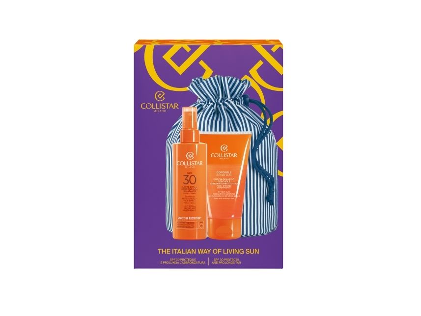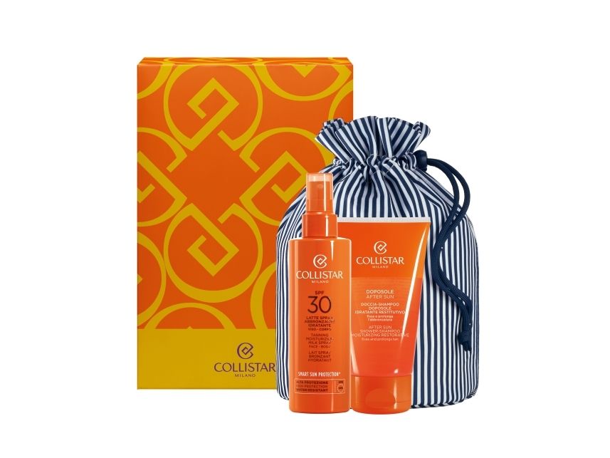 COLLISTAR set (moisturizing tanning milk spray SPF30 200 ml + after sun shower-shampoo 150 ml + pouch)