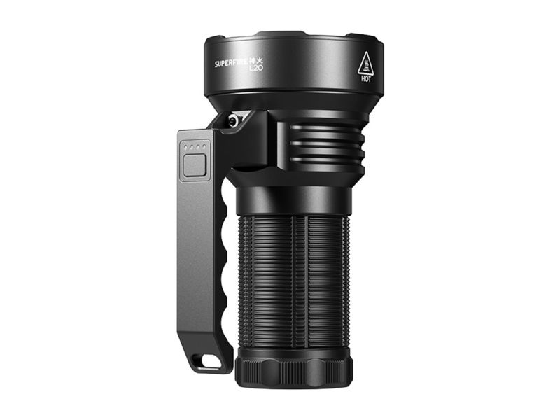 The advanced 60-watt LED module and 74mm-diameter aluminum reflector provide a strong, focused light beam with high intensity and a range of up to 600m. This allows the L20 flashlight to effectively illuminate objects at a considerable distance, ensuring clear visibility in total darkness.