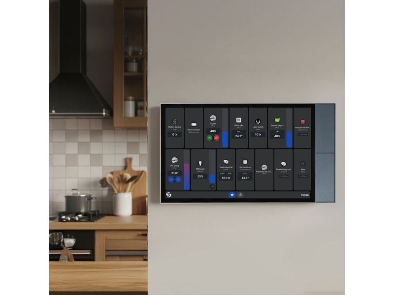 The Shelly Wall Display XL is a high-performance, Android-based 10.1 touchscreen that provides seamless, centralized control of your smart home or office. Designed for easy installation in a standard European electrical box, the unit requires only a 230V power supply and a 2.4 GHz Wi-Fi connection. Key Features, Large 10.1 capacitive touchscreen with an intuitive user interface, Four programmable hardware buttons for quick access to custom actions, Flexible installation: Can be mounted horizontally or vertically in a standard wall box, Built-in 5A relay: Ideal for controlling lighting, underfloor heating, or other connected loads, Integrated sensors: Measures temperature, humidity, and ambient light levels, Thermostat functionality: Supports smart room temperature regulation, Real-time power monitoring: View live energy consumption directly on the display, Audio integration: Control Bluetooth and Sonos speakers directly from the interface. Home Assistant Integration, The Wall Display XL features full Home Assistant compatibility, letting you display your Home Assistant dashboards directly on the screen without the need for custom firmware or additional installation steps. Users can easily switch between the Shelly Smart Control interface and their Home Assistant dashboard. Bluetooth Gateway Functionality. With integrated Bluetooth, the Wall Display XL also functions as a gateway for Shelly Bluetooth (BLU) devices, enabling extended functionality across your local network without requiring additional hubs.