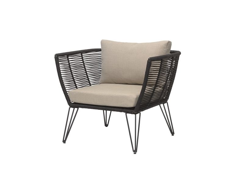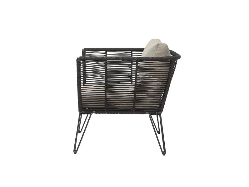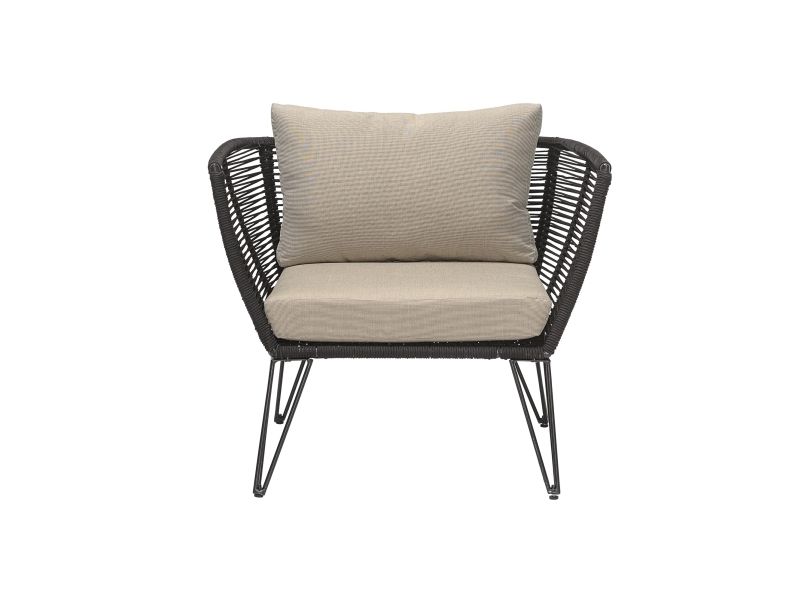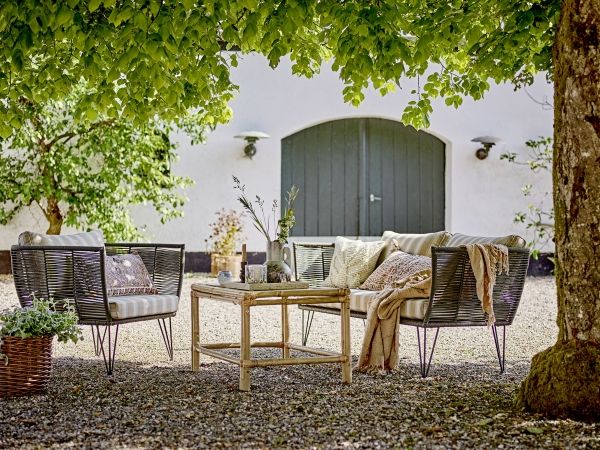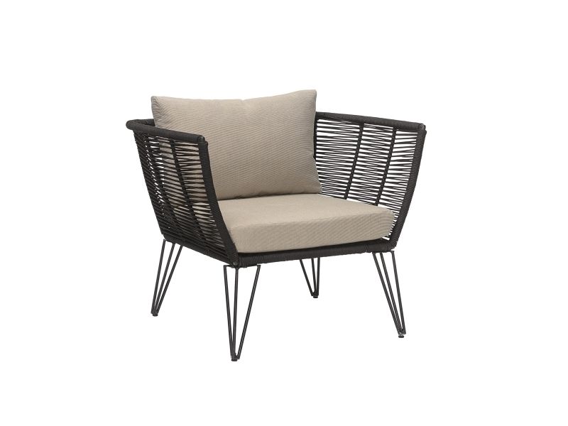 The Mundo Lounge Chair by Bloomingville is made of powder-coated black metal with a black polyester rope hand-woven onto the frame. The cushion covers in a light brown color are made of polyester and can be washed at 30 degrees. The garden chair is suitable for all outdoor areas, but by protecting the chair from direct sunlight, the color of the fabric and the durability of the chair will be extended. Enjoy an outdoor chair in high comfort and with soft cushions – perfect when it's time for relaxation and coziness.