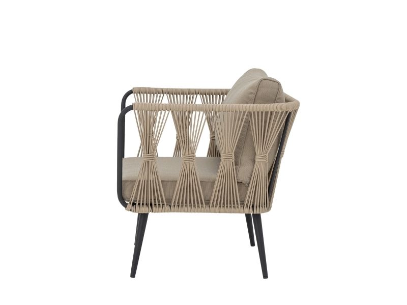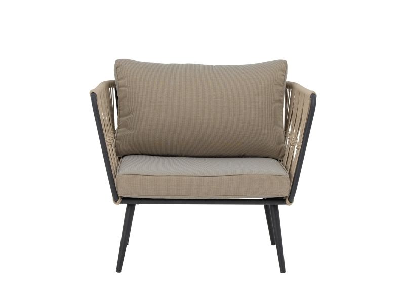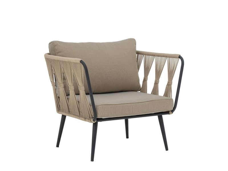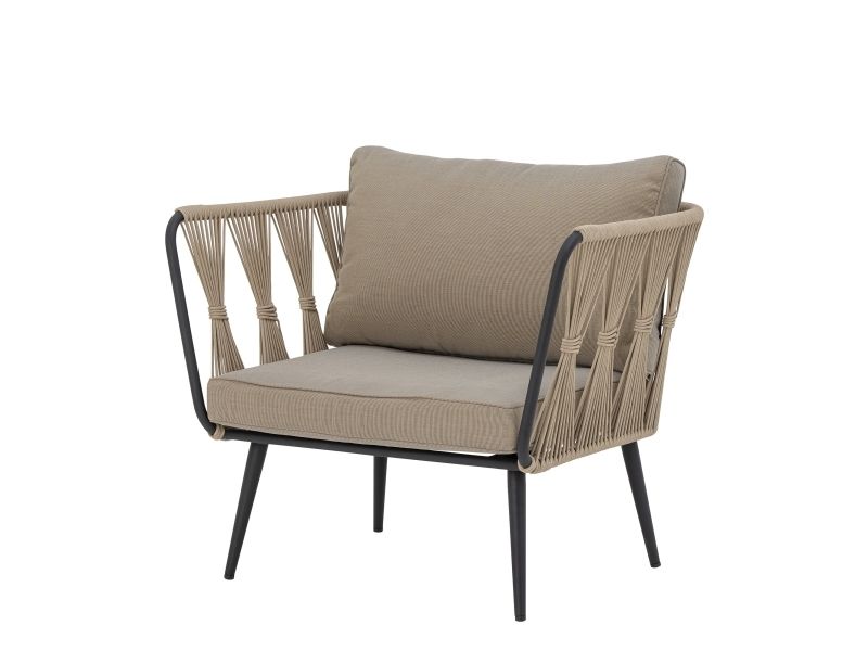 The Pavone Lounge Chair by Bloomingville is designed with a nordic look and beautiful details. It is made of powder-coated black metal with a light brown polyester rope hand-woven onto the frame. The matching cushion covers in beige hues are made of polyester and can be washed at 30 degrees. The garden chair is suitable for all outdoor areas, but by protecting the chair from direct sunlight, the color of the fabric and the durability of the chair will be extended. Enjoy a beautiful outdoor lounge chair with high comfort.