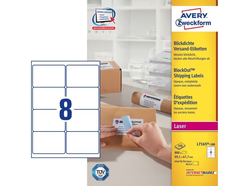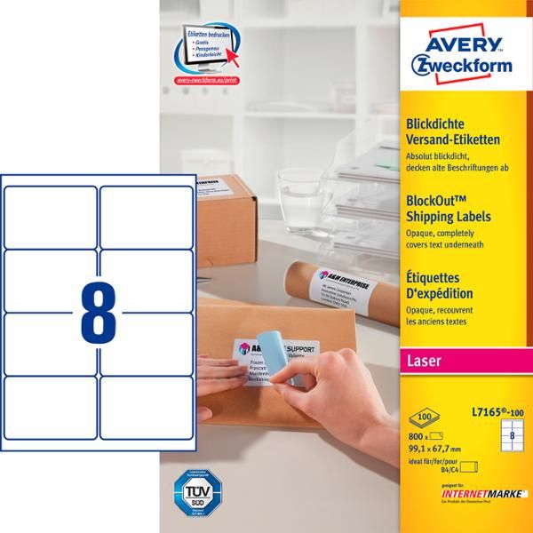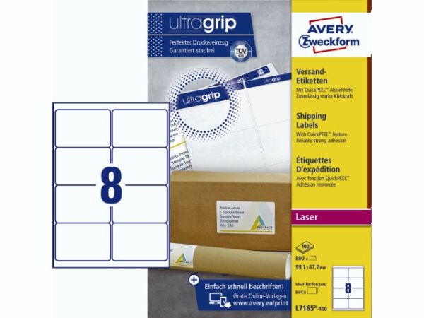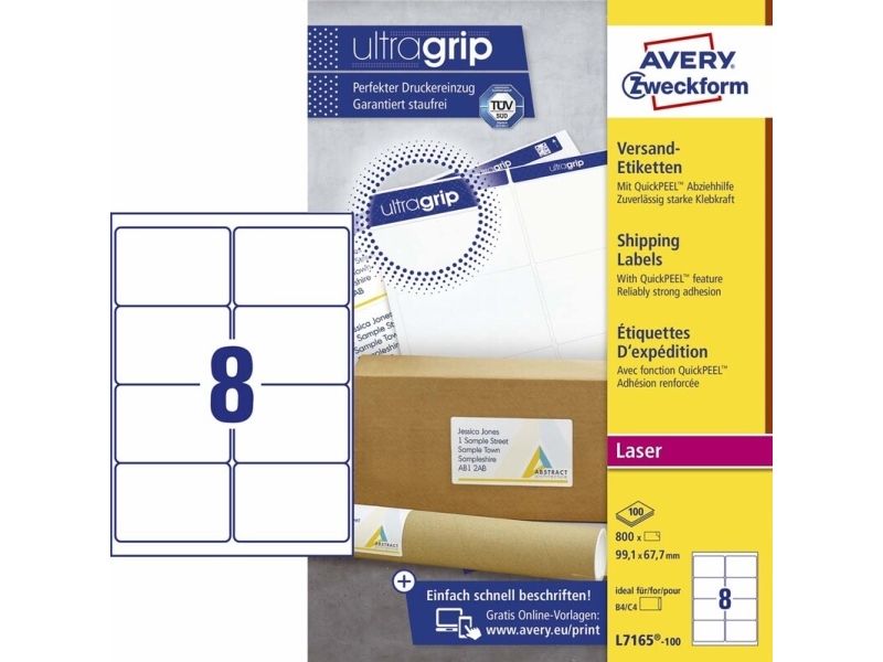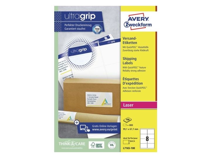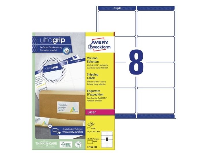 Giv dine pakker og breve et professionelt udtryk ved at bruge Avery pakke-etiketter. Avery's L7165-100 pakke-etiketter med QuickPEEL™ & Ultragrip har 8 etiketter/ark og 800 etiketter/pk, og er fremstillet i et højkvalitetsmateriale, der holder til hele turen. Etiketstørrelsen er særlig ideel til B4/C4 konvolutter, samt til mindre pakker, rør og kasser.