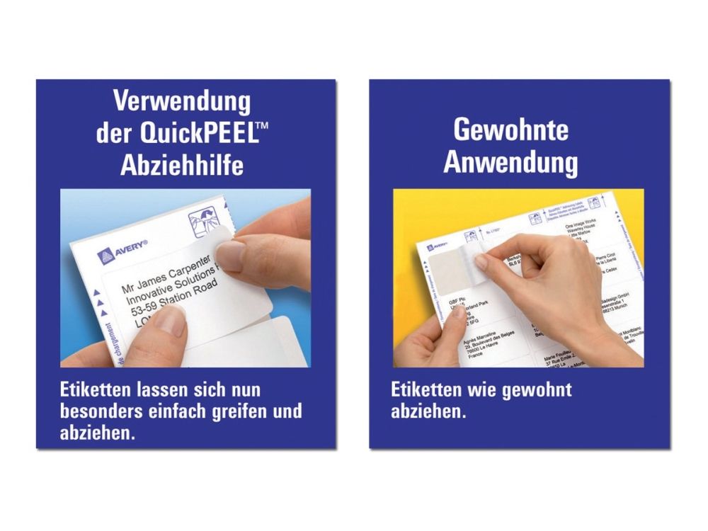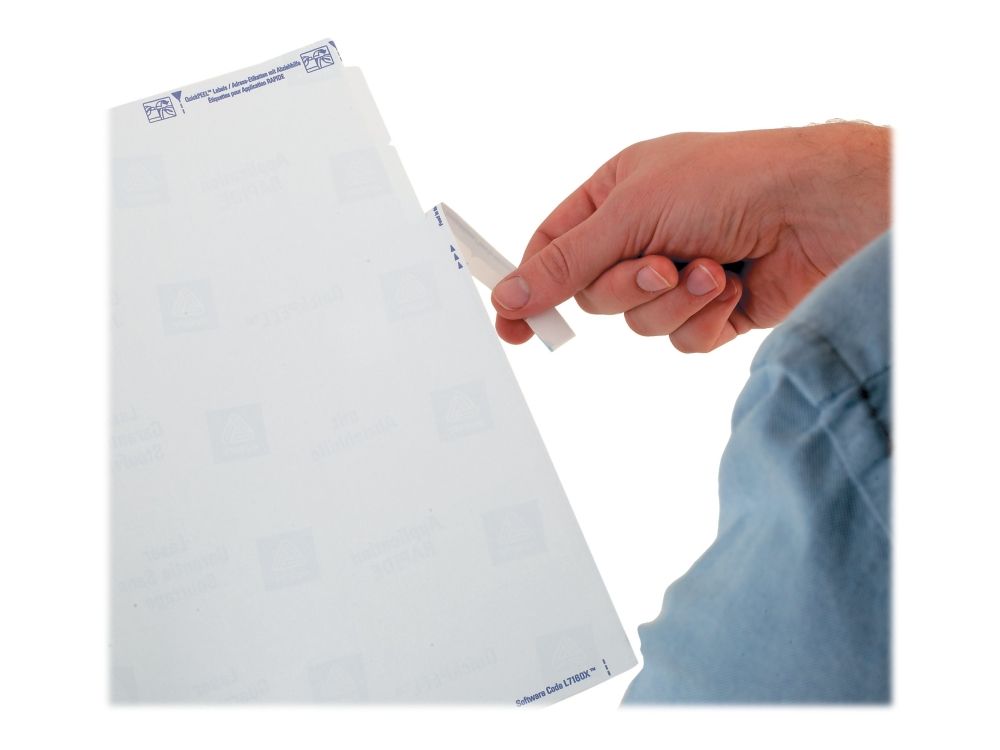 Derudover får du etiketter med QuickPEEL™ funktion. Det vil sige, at du skal blot fjerne den perforerede del af bagarket for at blotte hjørnerne af etiketterne så du nemt kan få dem af og sætte dem på konvolutterne. Det giver en væsentlig tidsbesparelse, fordi du ikke skal fumle med at få fat i hjørnerne af etiketterne – faktisk helt op til 25% af den tid, du bruger, hvis du ikke benytter QuickPEEL™ funktionen. Du kan selvfølgelig også tage dem af på normalvis uden at fjerne den perforerede del.