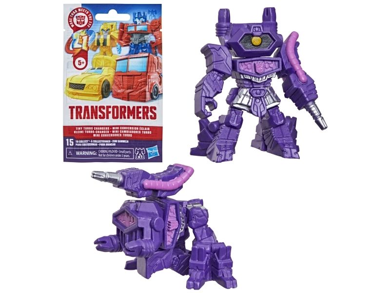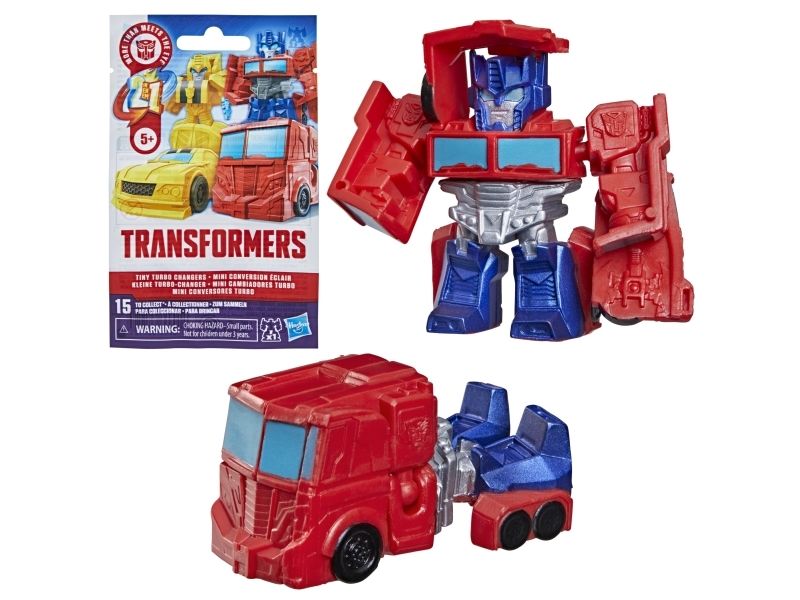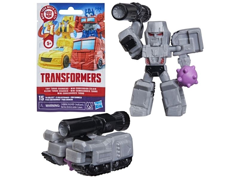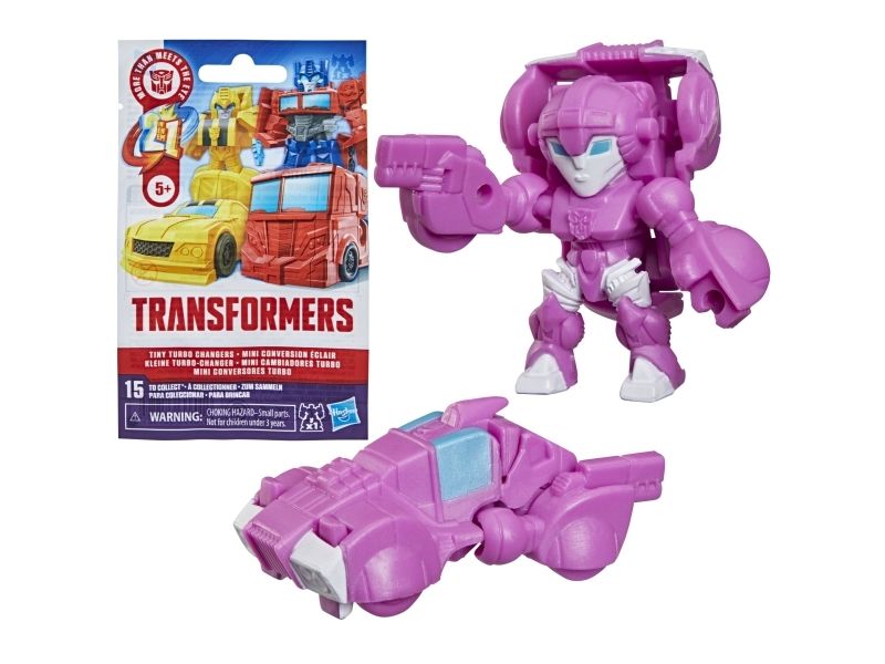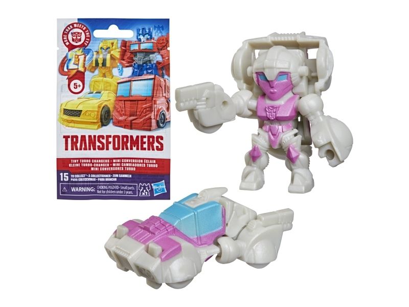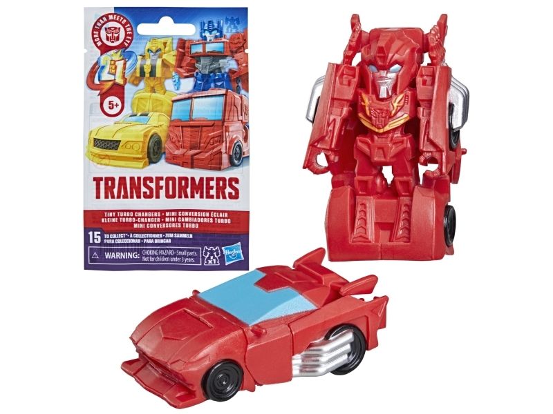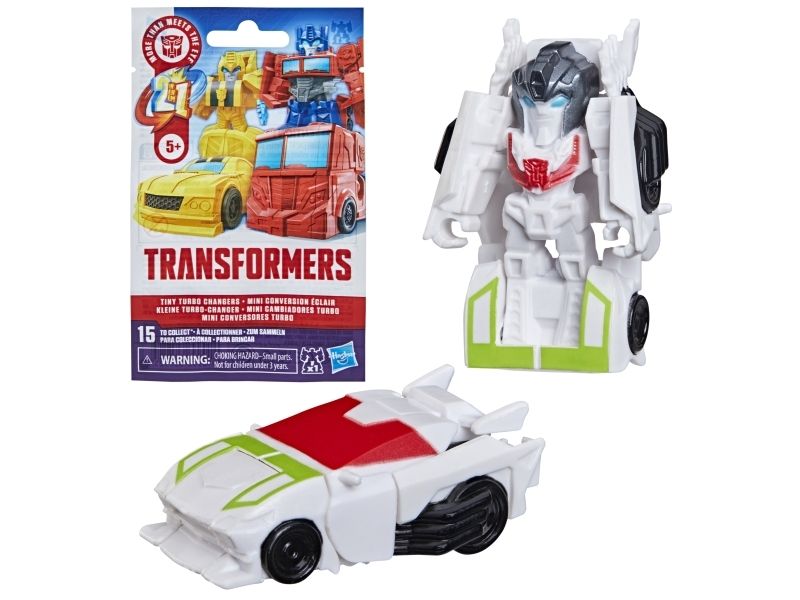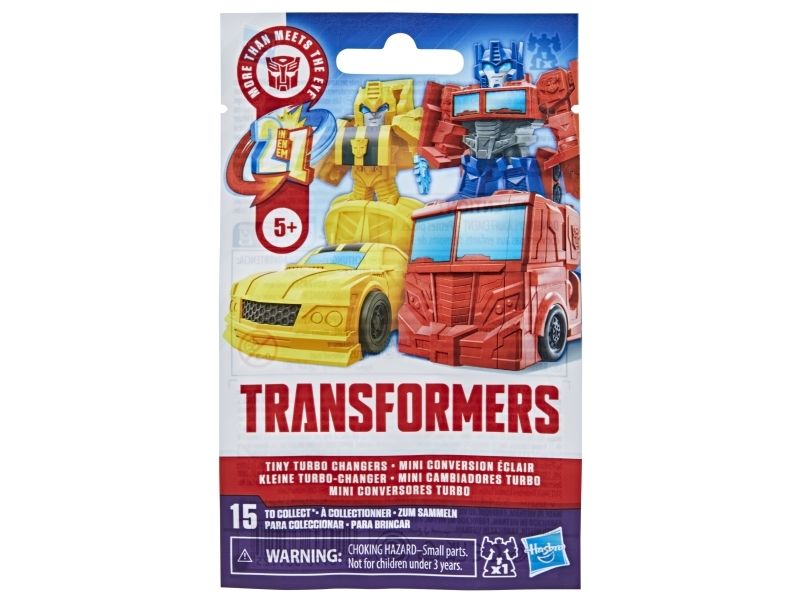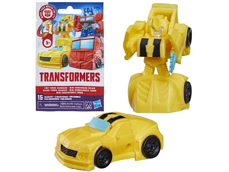 Discover 1 of 15 surprise mini action figures with Transformers Tiny Turbo Changers toys! Each 3.5-cm (1.5 inch) figure changes from robot mode to alt mode in just 2 to 5 steps that are simple enough for children ages 5 and up. Possible characters are Optimus Prime, Bumblebee, Wheeljack, Autobot Whirl, Arcee, Autobot Hot Rod, Autobot Ratchet, Elita-1, Grimlock, Megatron, Shockwave, Soundwave, Starscream, Blackarachnia and Sky-Byte. These small Transformers toys make great stocking fillers, Easter basket stuffers or birthday party favour toys. TRANSFORMERS and HASBRO and all related trademarks and logos are trademarks of Hasbro, Inc.