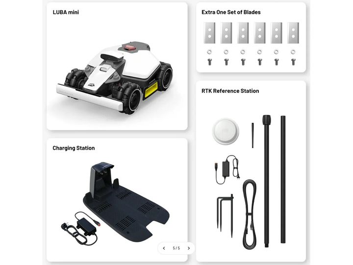 Mammotion LUBA mini AWD. Type: Robotic lawn mower, Maximum lawn area: 1500 m², Cutting width: 20 cm. Power source: Battery, Charging time: 3.2 h, Battery capacity: 6.1 Ah. Width: 430 mm, Depth: 584 mm, Height: 282 mm. Warranty period: 3 year(s)