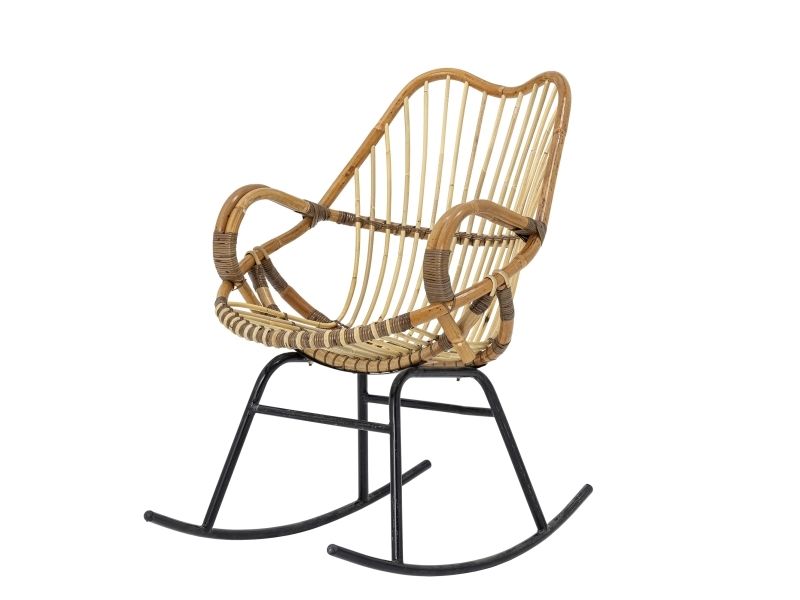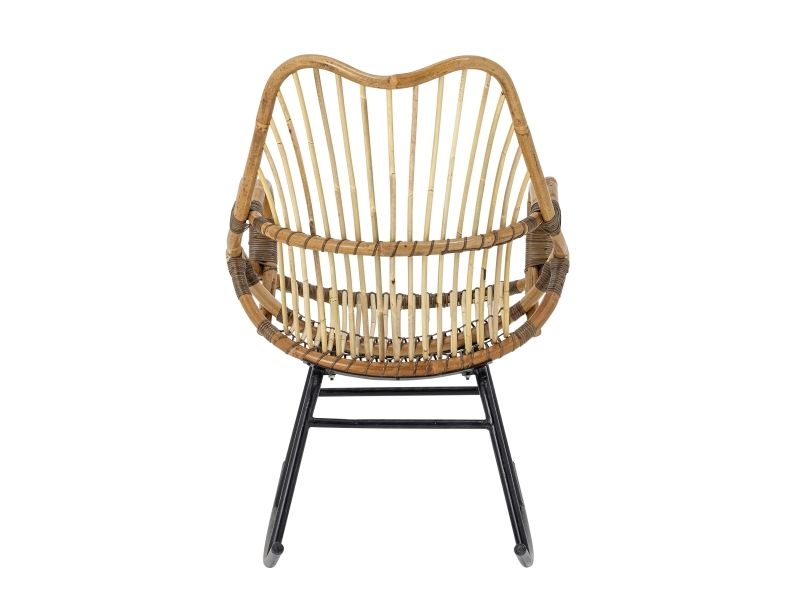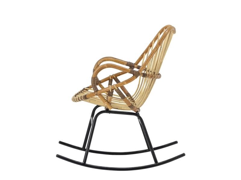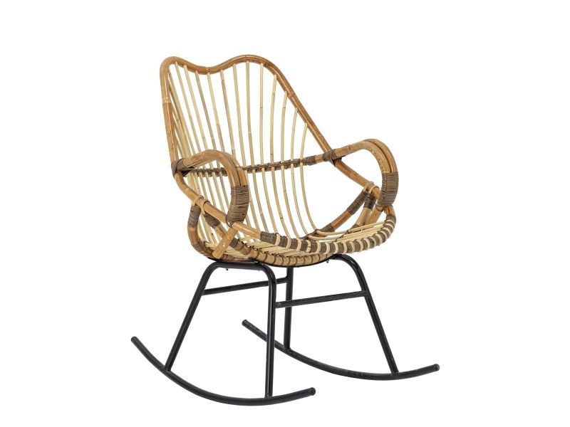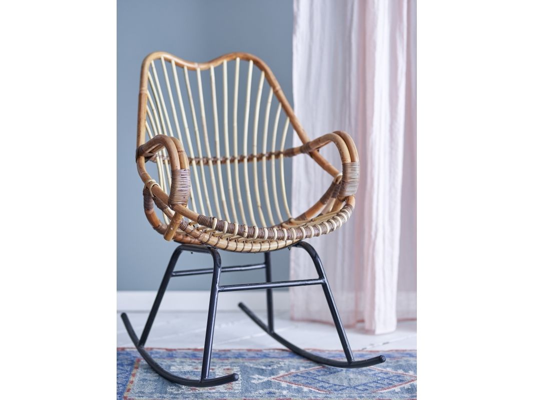 The Reine Rocking Chair from Bloomingville is made of natural rattan, woven in an open pattern that not only creates an airy and light expression but also provides comfortable support. The chair rests on a sturdy black metal frame, adding a sharp contrast to the design. This chair offers a fresh touch to classic decor or a cozy nook in a modern home, with its inviting and stylish look. The frame is powder-coated while the chair is coated with water-based lacquer.