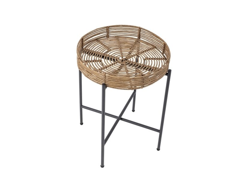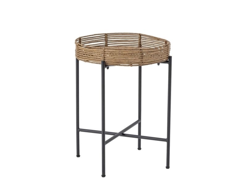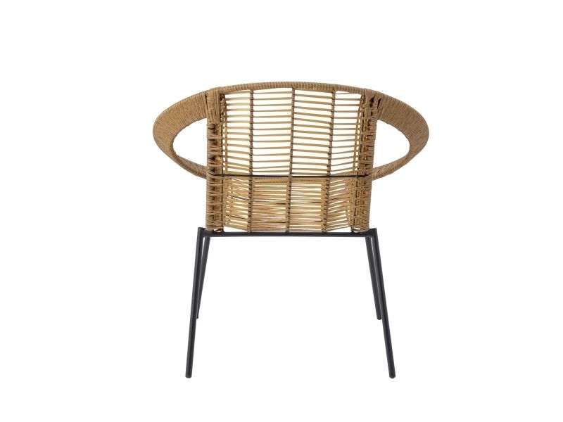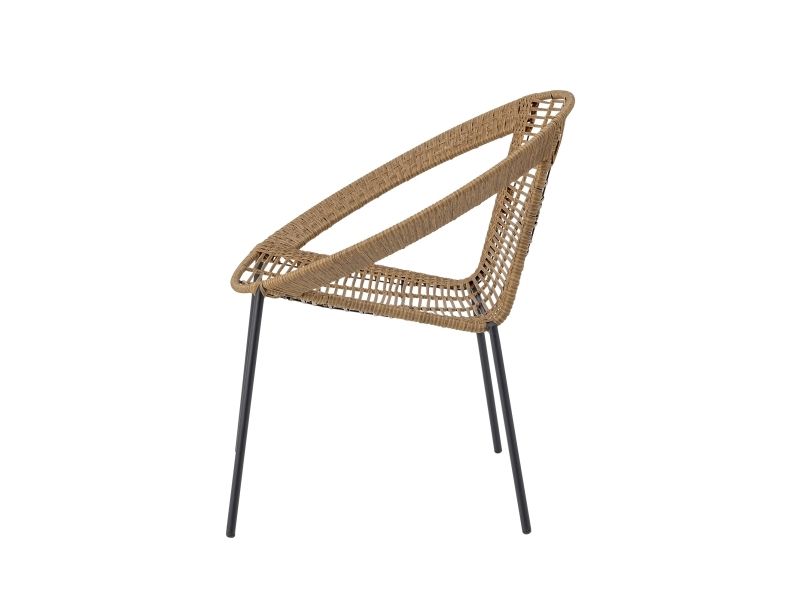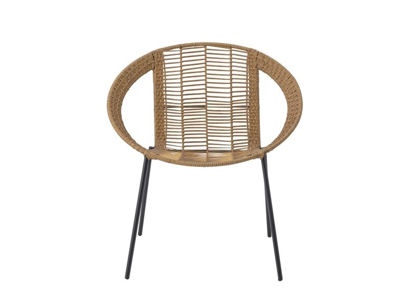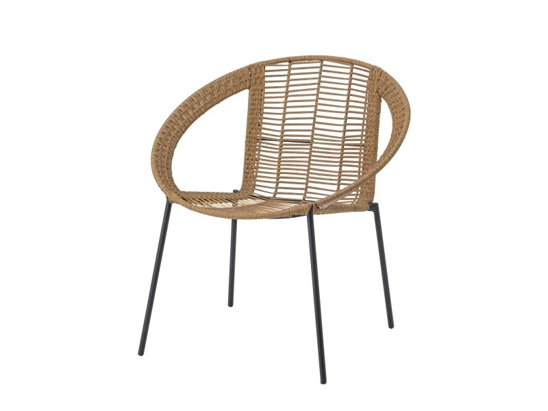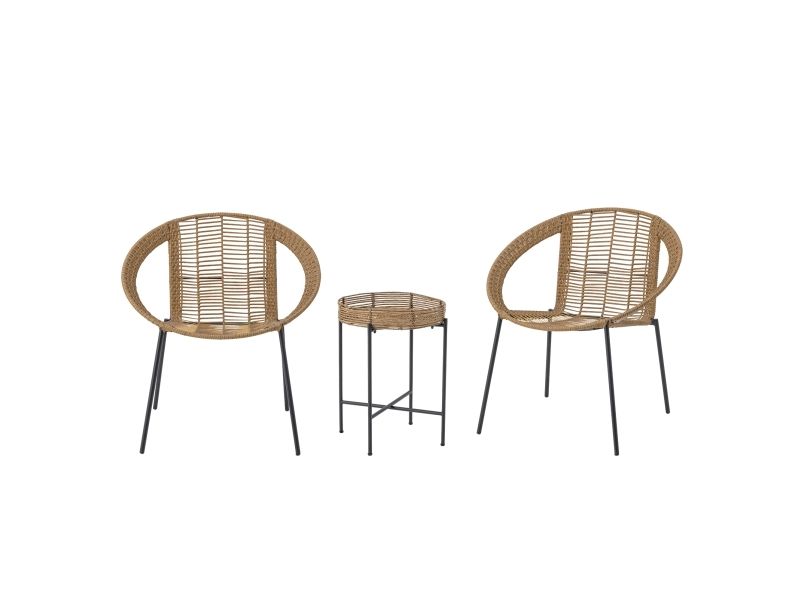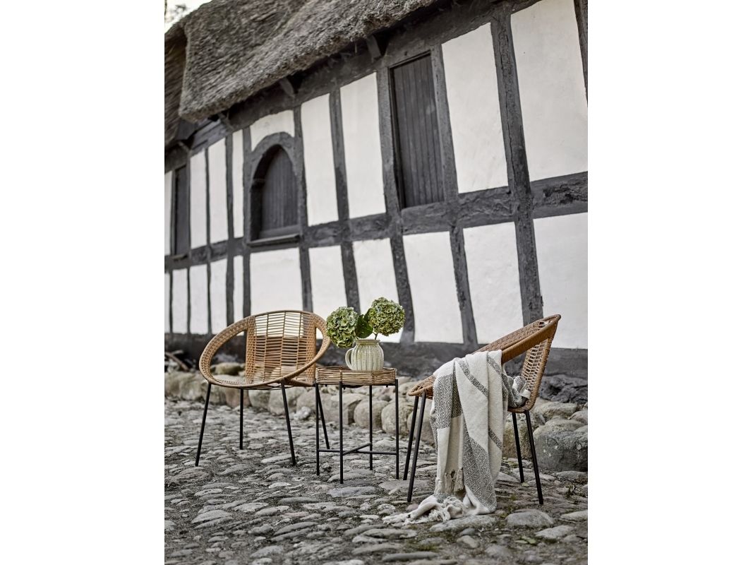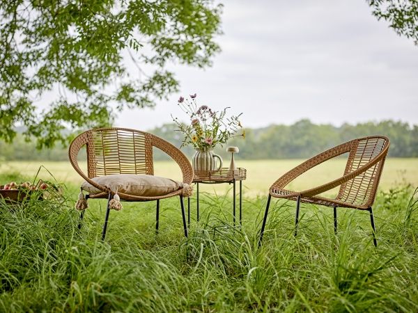 The Dudine Lounge set by Bloomingville is a three-piece set for the terrace or garden. It includes two stackable lounge chairs and a round table with a raised edge. Made of light brown polyrattan and black metal, it has a light, elegant look. We recommend placing outdoor furniture in covered areas.