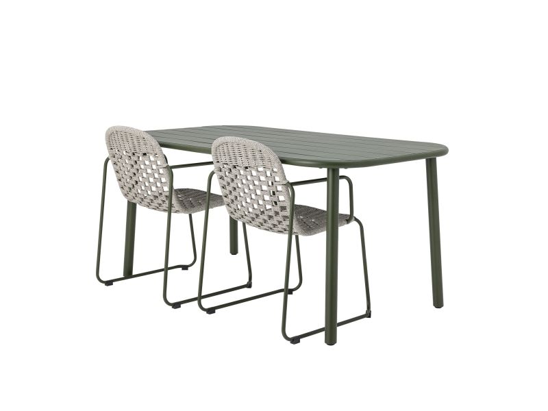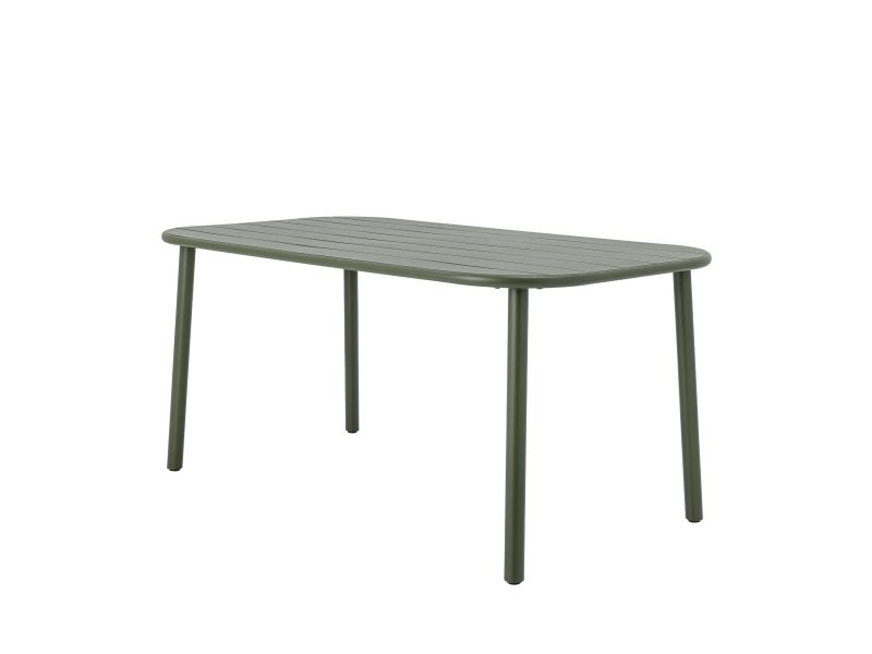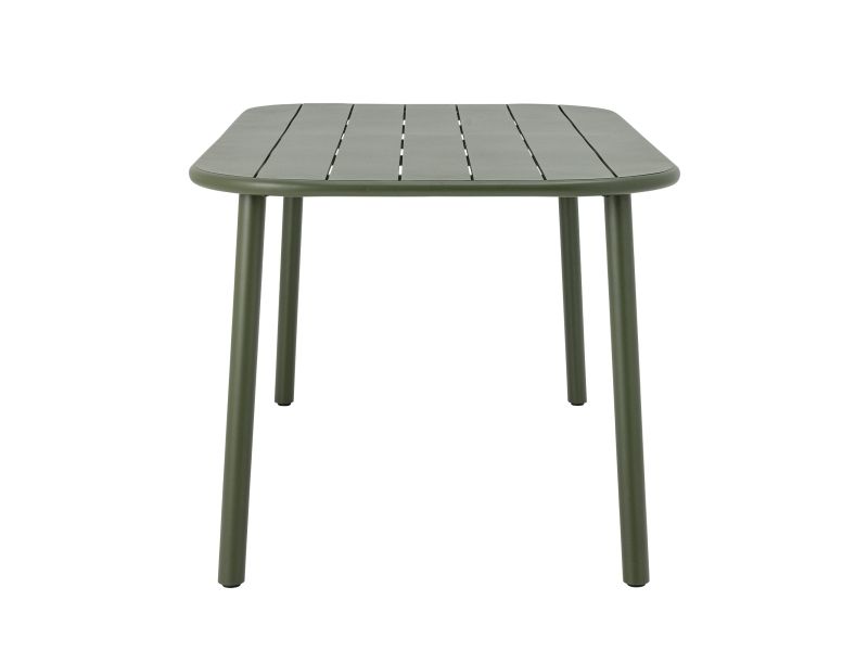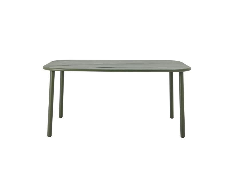 The Calana Dining Table by Bloomingville features a curved rectangular top with fine horizontal lines and rounded edges. Made with a deep green, powder-coated metal frame and tubular legs, it has a soft, modern look that adds a light and elegant touch to the outdoor dining area.