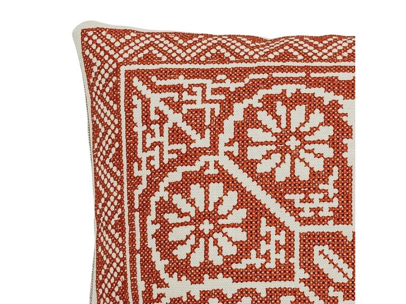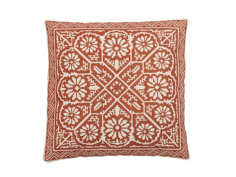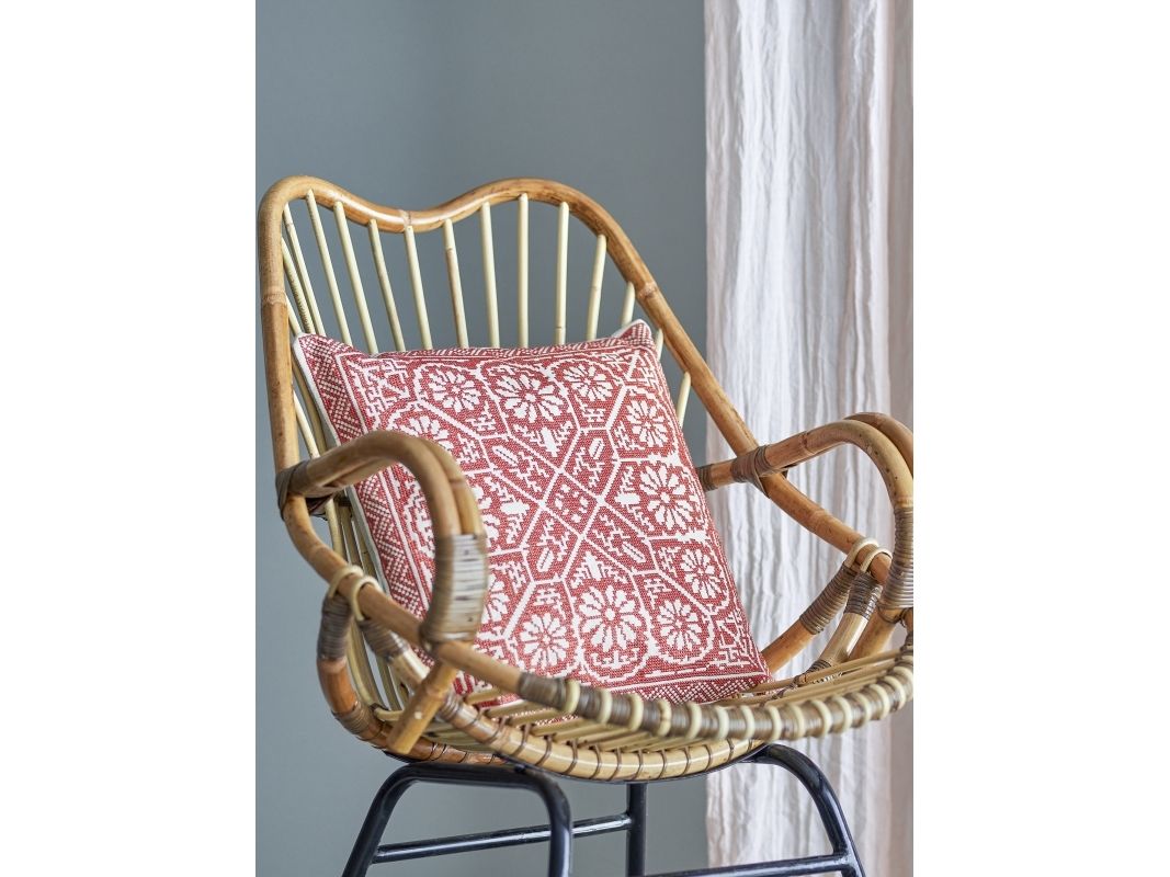 The Madita Cushion by Bloomingville features a traditional pattern in warm red and natural white colors. The cushion is designed with symmetrical patterns and detailed floral motifs. The clear color contrast and intricate pattern make the cushion a striking element in any living room or bedroom, ideal for adding texture and a sense of warmth to your space.