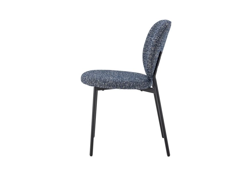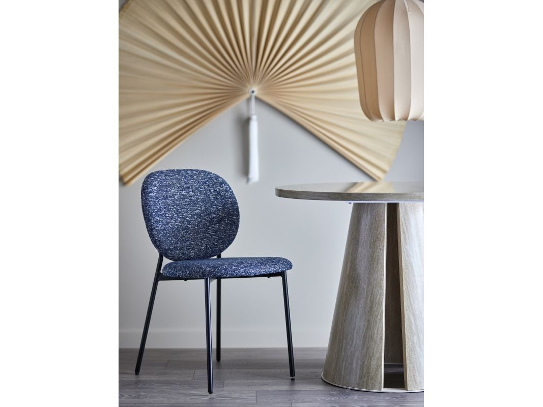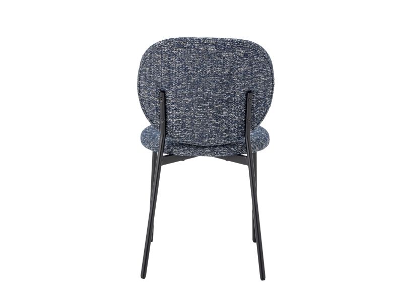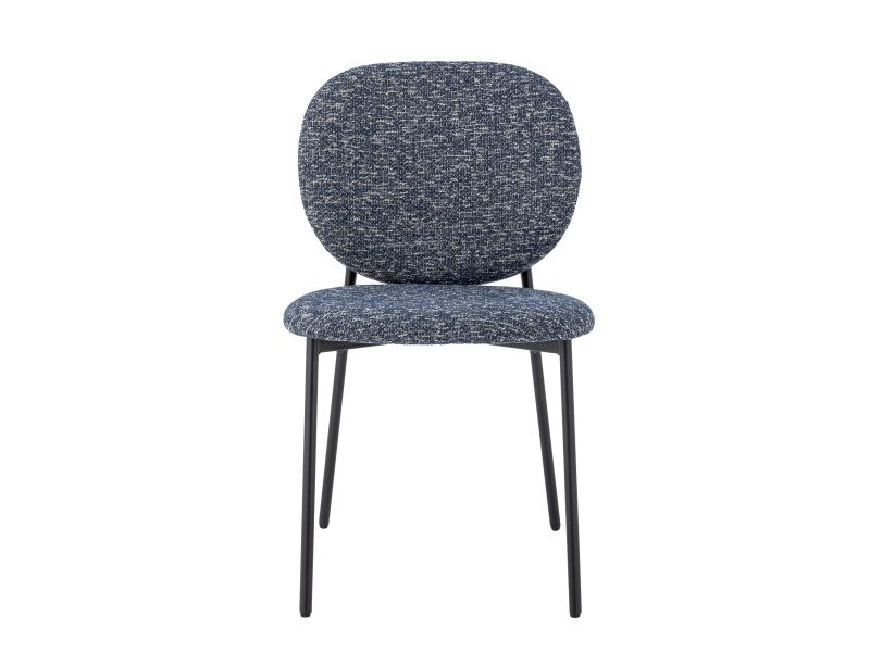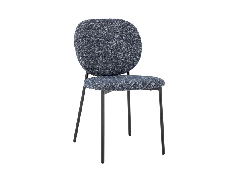The Percey Dining Chair by Bloomingville features a padded seat and backrest in blue chenille fabric, giving it a soft and textured appearance. The chair includes FSC®-certified plywood in its construction and metal legs. It is stackable and comes with adjustable feet caps to ensure stability on different surfaces.
