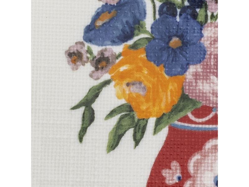 The Dorothy Cake Tray by Bloomingville is an elegant pedestal cake stand adorned with a beautiful embossed floral motif in shades of red, blue, yellow, and green. The intricate pattern, resembling fine embroidery, gives the stand a unique look. This stand is ideal for serving cakes and small dishes.