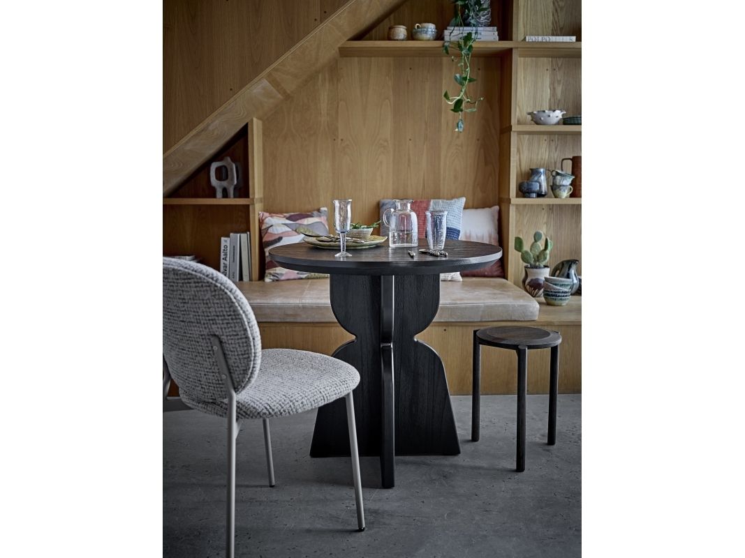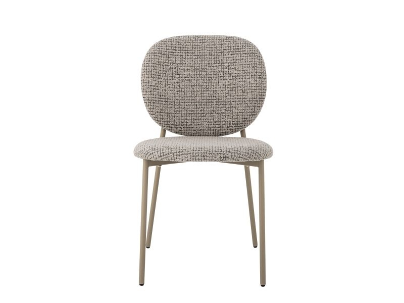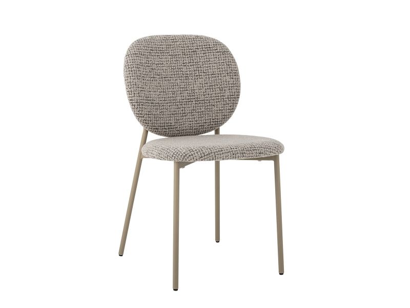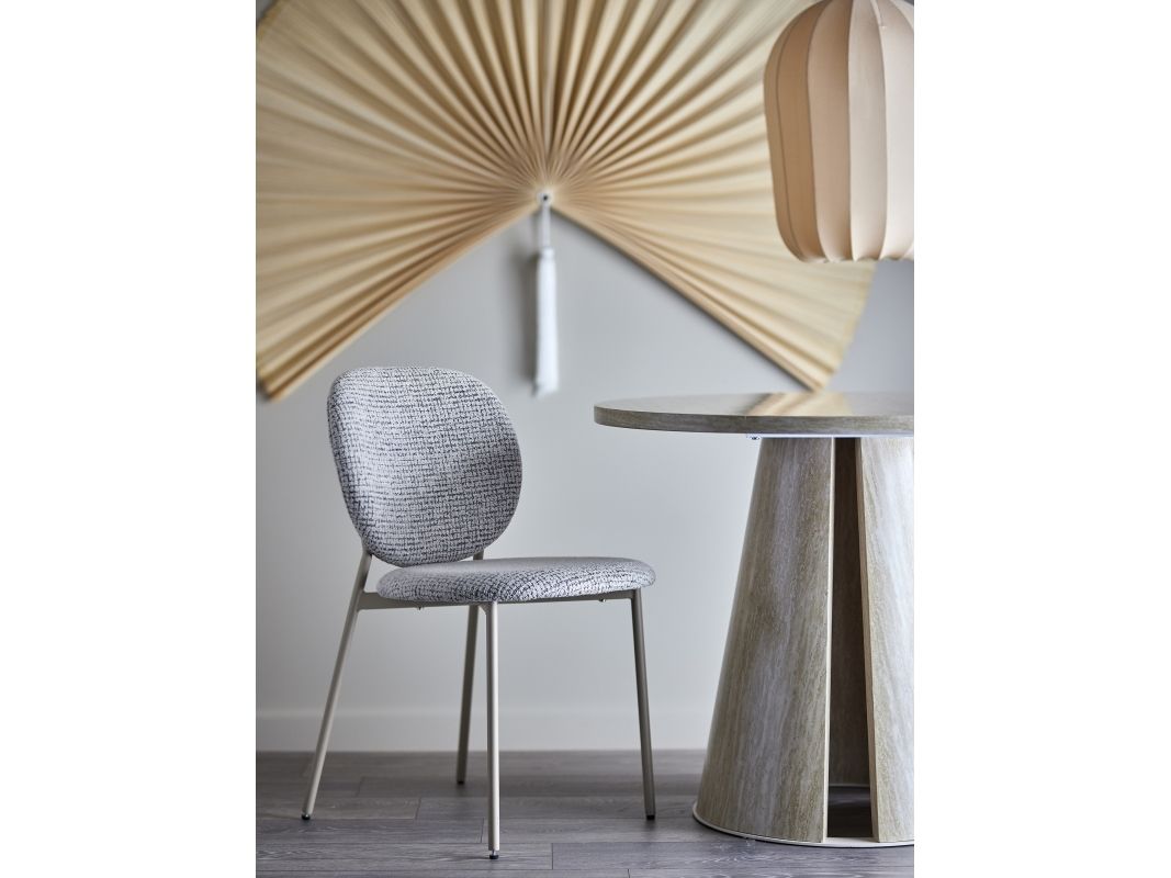 The Percey Dining Chair by Bloomingville features a padded seat and backrest in grey melange chenille fabric, offering a soft and textured appearance. The chair is constructed with metal legs and plywood. It is stackable and comes with adjustable feet caps to ensure stability on different surfaces.