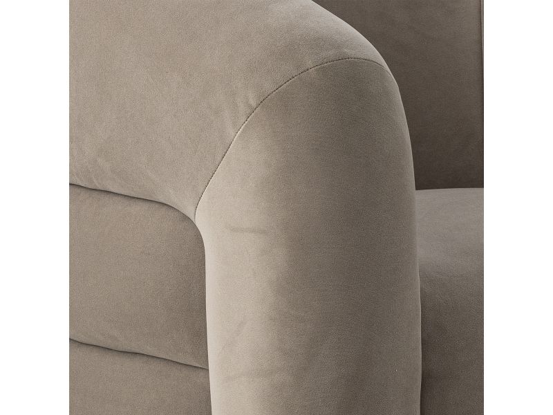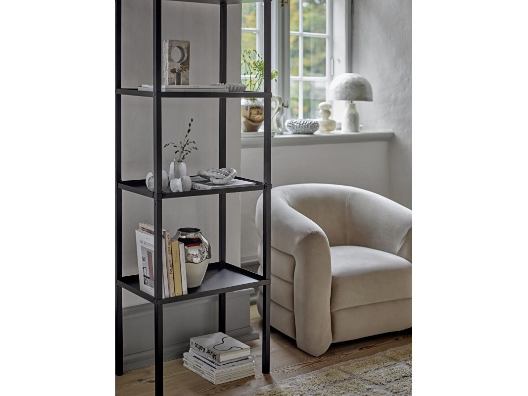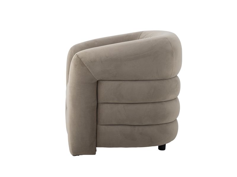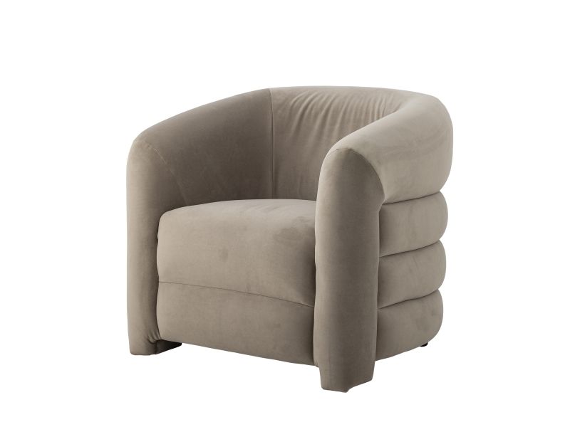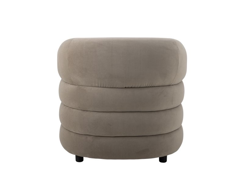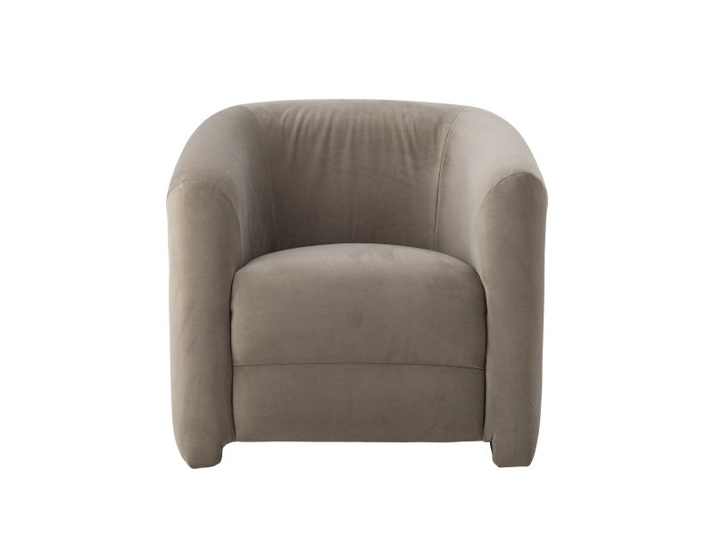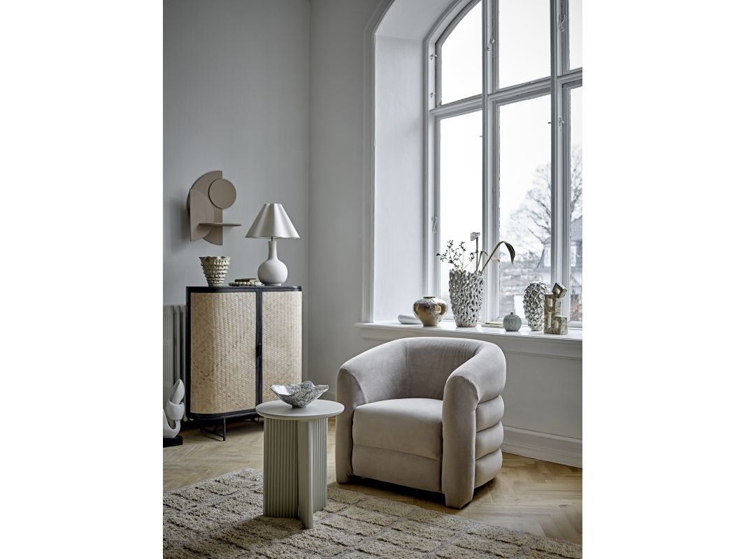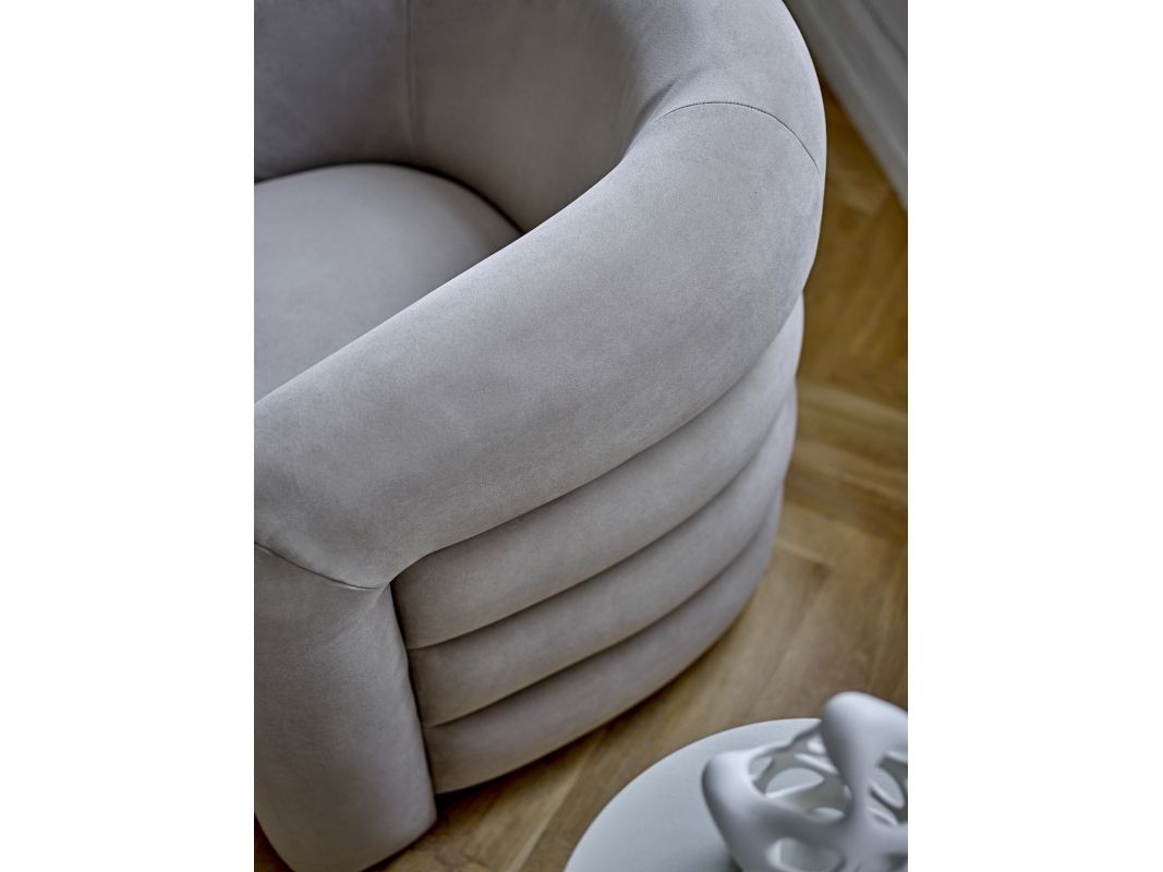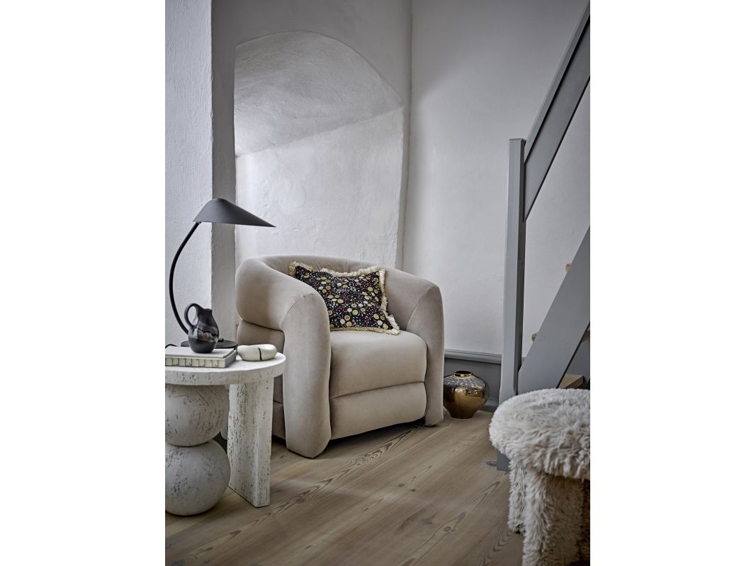 The Joel Lounge Chair by Bloomingville combines stylish decor with comfort. The chair is upholstered in soft gray velvet and has a round, embracing back that invites relaxation.