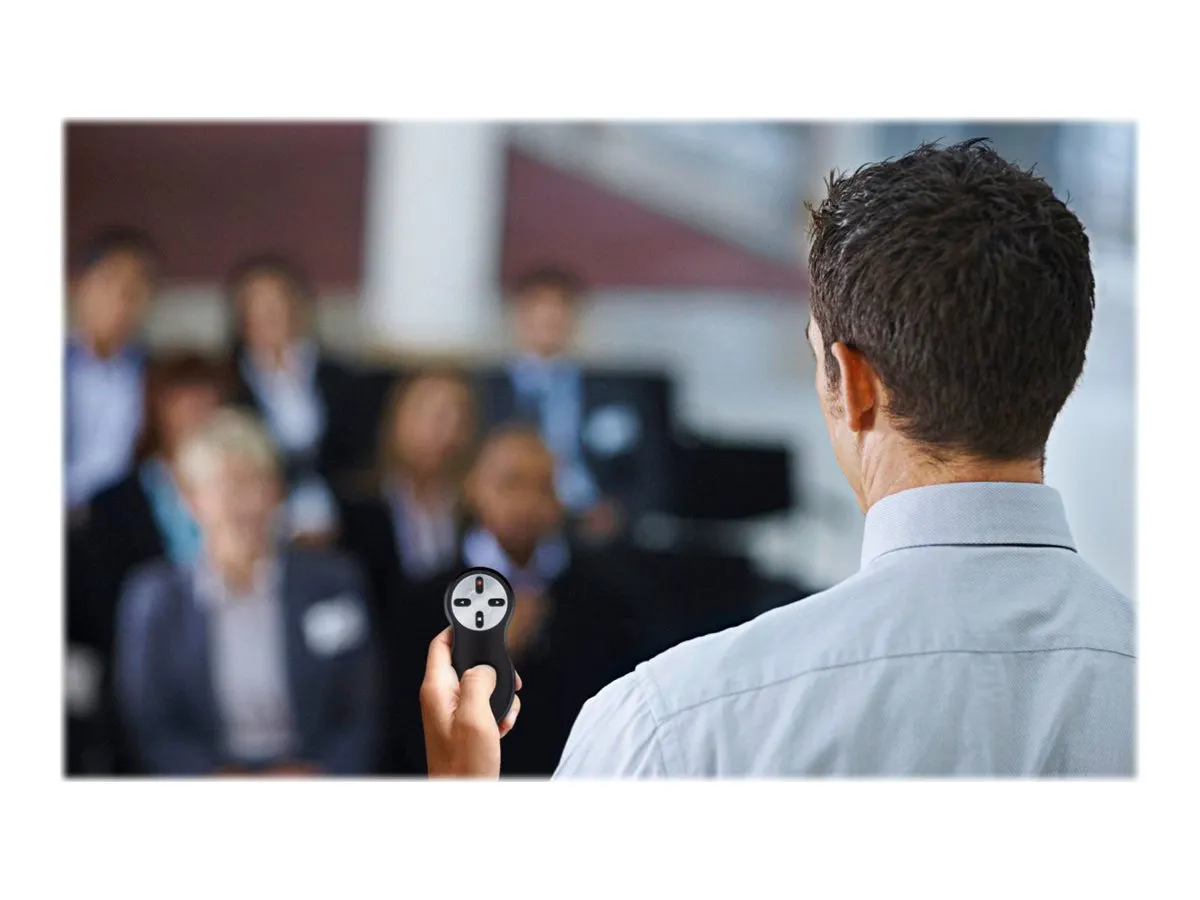 Professionals count on Kensington for control of their presentations. With a highly reliable wireless connection and intuitive controls, this remote allows you to focus on what matters most — making an effective presentation. With a 4-button layout, you can easily go forward and back on your PowerPoint® or Keynote® slides, while the other two buttons offer a screen blackout option and a red laser pointer. The wireless 2.4GHz receiver stores conveniently inside the remote, and since it’s uniquely paired, you don’t have to worry about device interference.