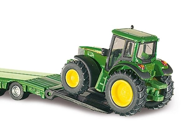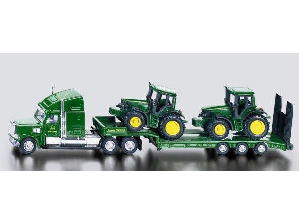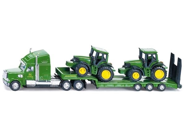 Detailed low loader with 2 John Deere tractors. Robust and stable metal construction, Detachable low loader, Movable tailgate, Excellent mobility thanks to rubber tyres. Countless possible combinations within the SIKU Farmer world. Scale: 1:87, Material: metal/plastic, Dimensions: 22.5 x 3.2 x 5.2 cm.