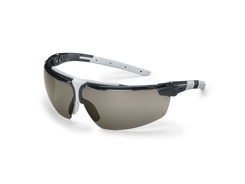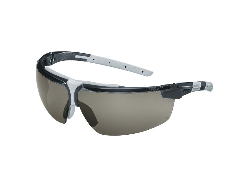 fashionable, 3-component safety spectacles with innovative features 100 % metal-free frame colours: black, light grey PC lens in grey 23 % sunglare filter version certified to EN 166 (personal eye protection) and EN 172 (sunglare filters for industrial use) labelling: W 166 FT CE – 5-2.5 W 1 FTKN CE reliable UV 400 protection reliable protection provided by its perfect fit: multi-level side arm inclination allows the wearer to adjust the spectacles to suit their face adjustable nose loops prevent hazards caused by the spectacles slipping anti-fog for at least 16 seconds on the inside, extremely scratch-resistant and chemical-resistant on the outside (uvex supravision excellence) soft, adjustable nose loops, soft, anti-slip ear pieces and metal-free hinged side arms (3-component technology) for high wear comfort and to avoid pressure points