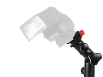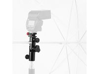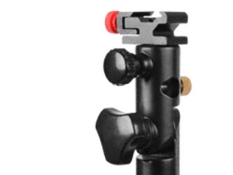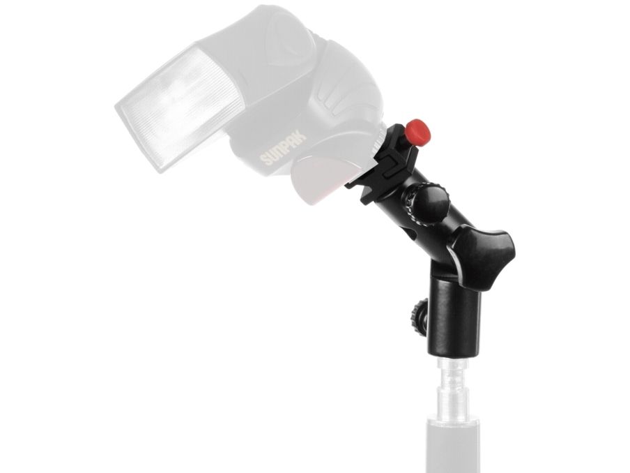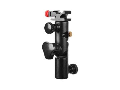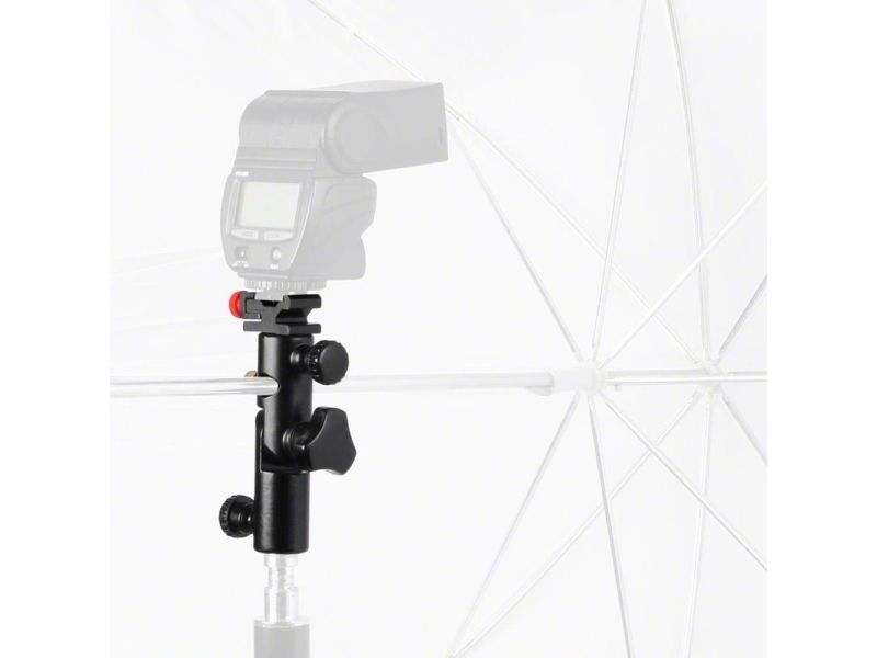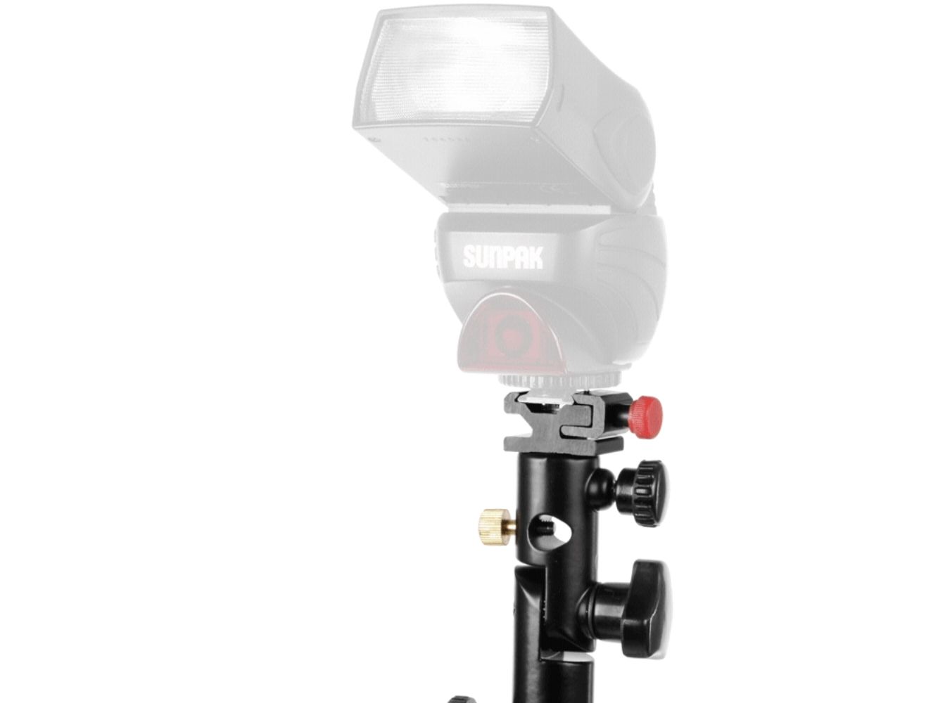 The Holder is tiltable, which is especially beneficial for flash devices without adjustable angle. The flash shoe offers a special extra: In contrast to many other holders, on which the flash feet can only be slided into the flash shoe, this walimex item provides a stable screw connection and therewith increased stability. The sturdy metal workmanship makes the product long-living and strong.