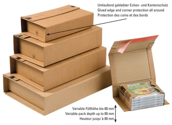 - The reliable ColomPac® self-sealing saves time and additional sealing materials. - With integrated tear open strip for fast and easy opening - Variable packed depth up to 80 mm - Made from sturdy B-flute - Strong corner protection and reinforced edges - FSC® certified and climate-neutral