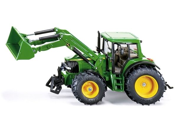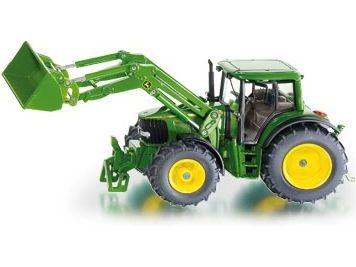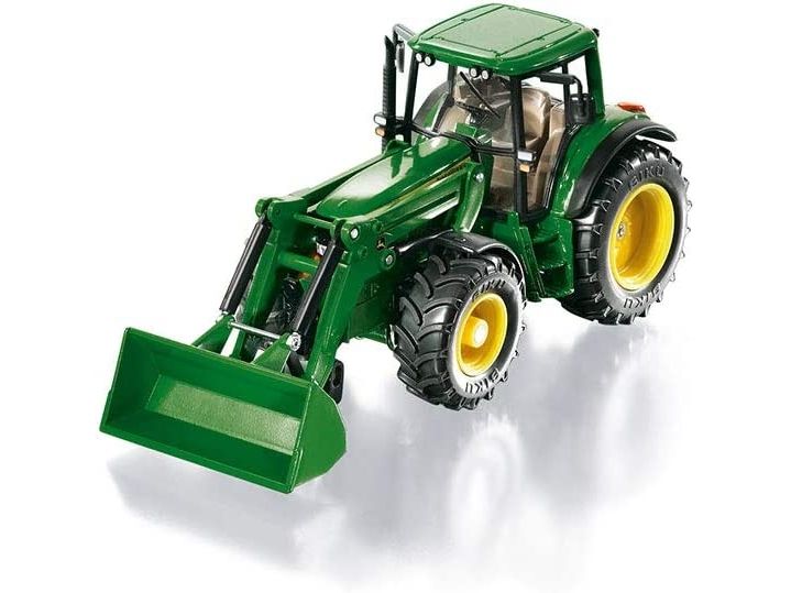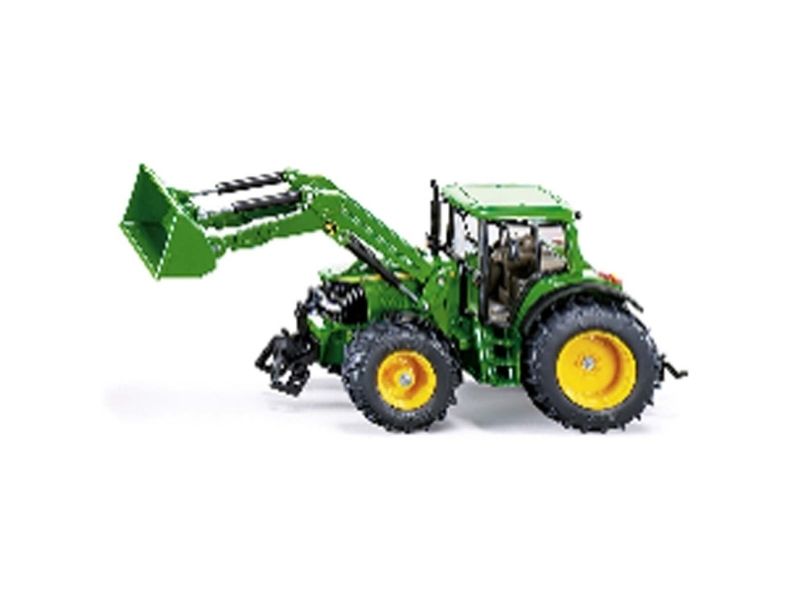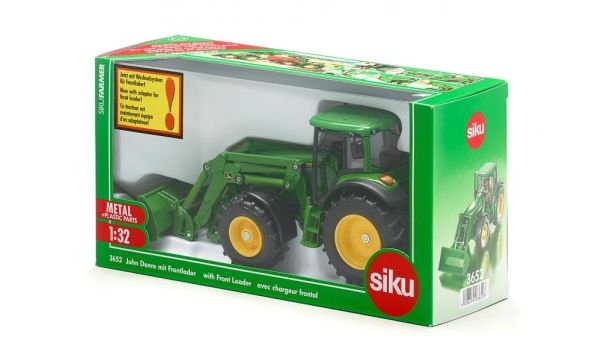 Detailed John Deere tractor with movable front loader. Robust and stable metal construction, Movable front loader, Multiple attachment options for front loader thanks to simple changing system, Removable cabin, Trailer hitch. Excellent addition to SIKU Farmer tractors of the same scale. Scale: 1:32, Material: metal/plastic, Dimensions: 24.3 x 8 x 9.6 cm.