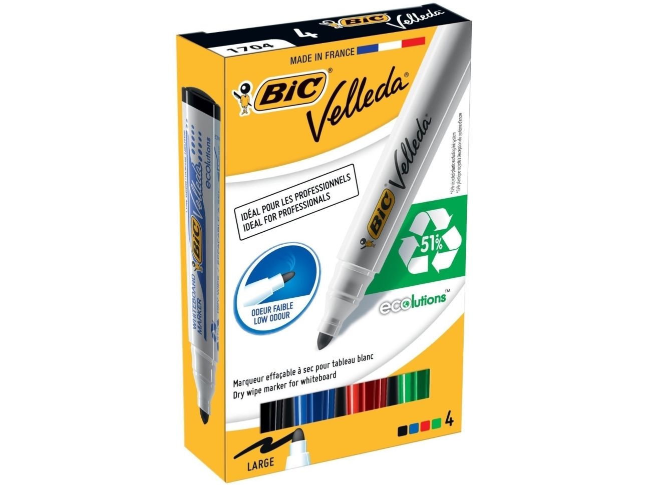 - Bullet tip, line width 1.5mm - Dry wipe ink - Alcohol-based ink: low odor - Vivid colors - Wipes off easily even after a few days - Plastic barrel - Cap color matches ink color - Ideal for everyday office use, great for meetings and conferences - PVC free product