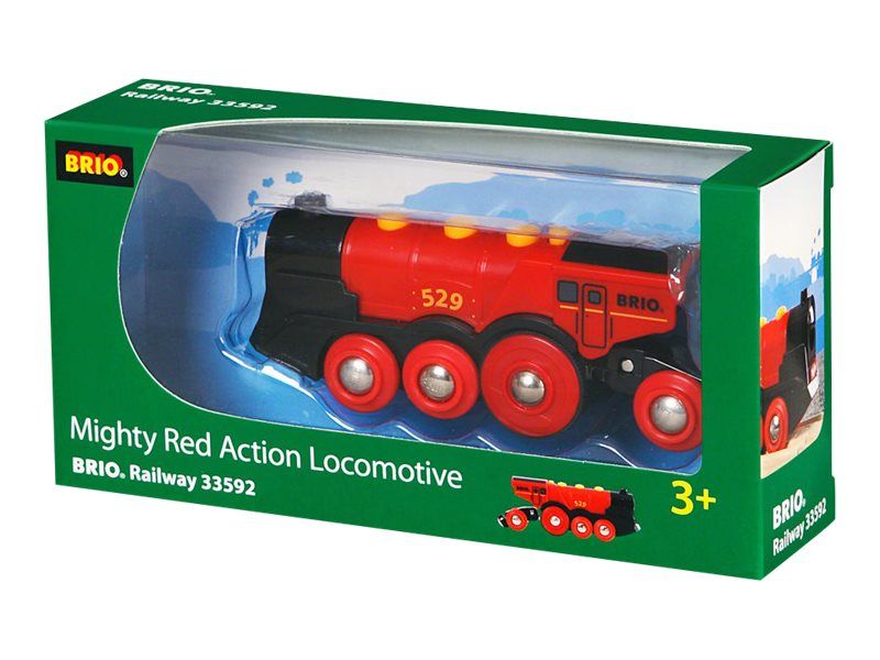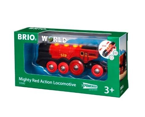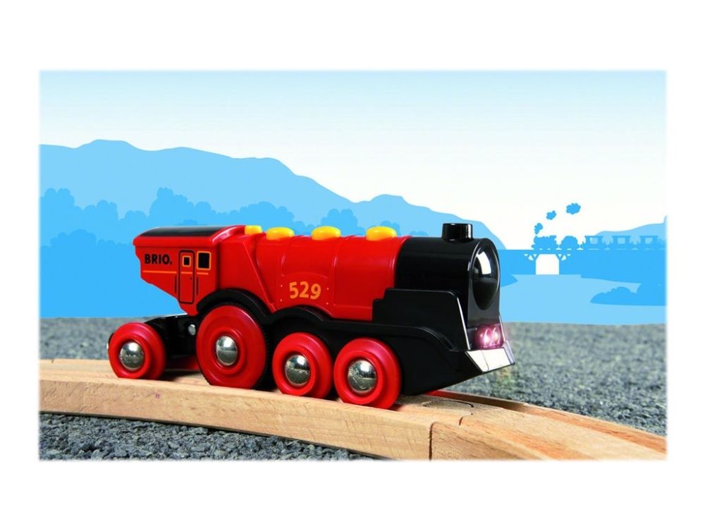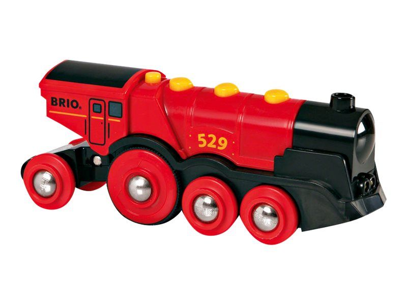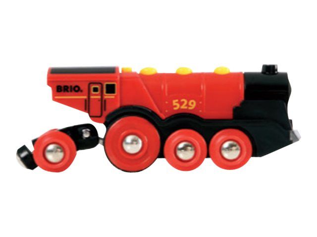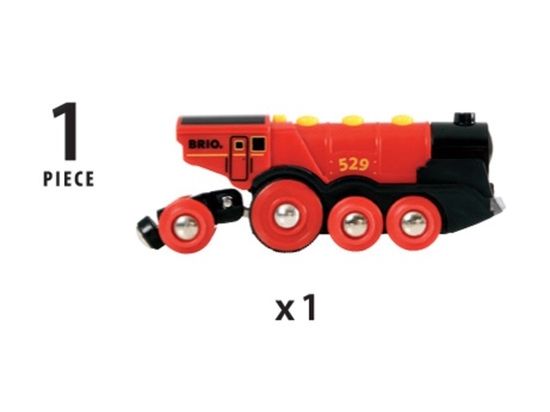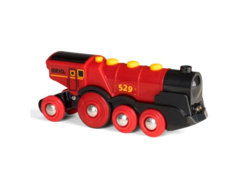 Keep aspiring train drivers occupied! The large battery operated locomotive has two front lights and manual buttons for "full steam ahead", reverse and the characteristic "choo-choo" sounds. Switch on top allows free wheel movement without battery function.