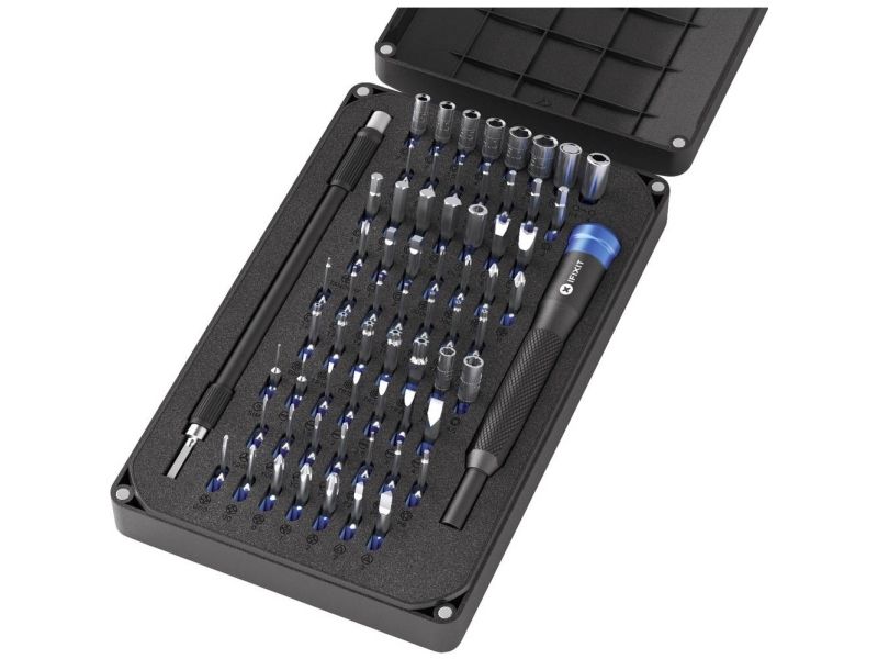 - The ultimate high-performance bit kit - The complete screw-turning solution for precision repair jobs. - Custom handle with two-zone grip profile provides up to 8.5 N-m of torque. - Textured precision zone for delicate screw turning - Three-faceted, large-diameter grip zone for heavy duty wrenching. - 64 purpose-driven screwdriver bits selected based on the data from thousands of repair guides. - This bit kit contains bits to repair cell phones, game consoles, wearables, laptops, desktops, tablets, small appliances, and much more! - The specially-designed case conveniently holds and displays all the contents in high-density foam. - The lid of the case features an integrated sorting tray. - Ergonomic Aluminum Handle provides plenty of torque and grip with swivel cap and magnetized bit holder.