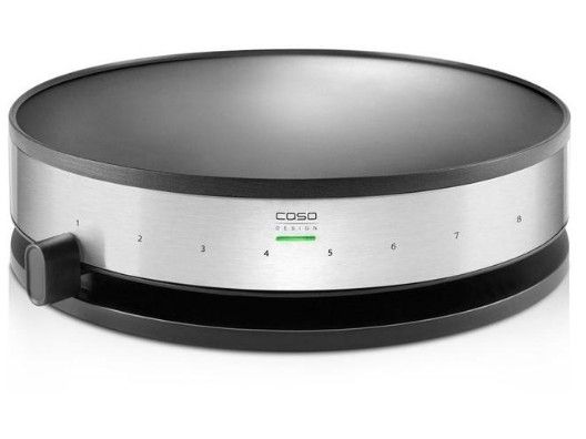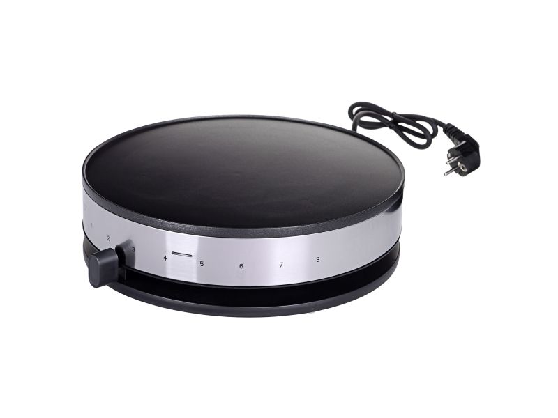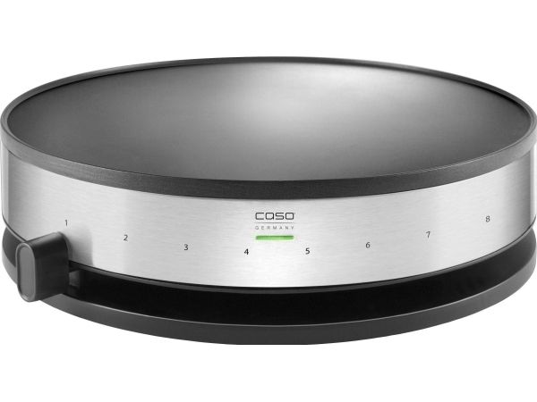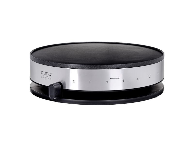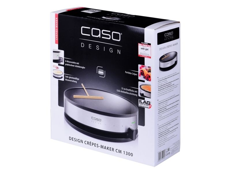 - Design Crêpes-Maker with brushed stainless steel housing. - Extra-large cooking surface 33cm in diameter. - Modern cylinder design. - Output: approx. 1300 Watt. - Even heat distribution through sub-soldered heating element. - High-quality ILAG non-stick coating. - Colour-changing LED to display temperature reached. - 8 heat stages with practical slide controls. - Batter spreader and wooden crêpes turner included.