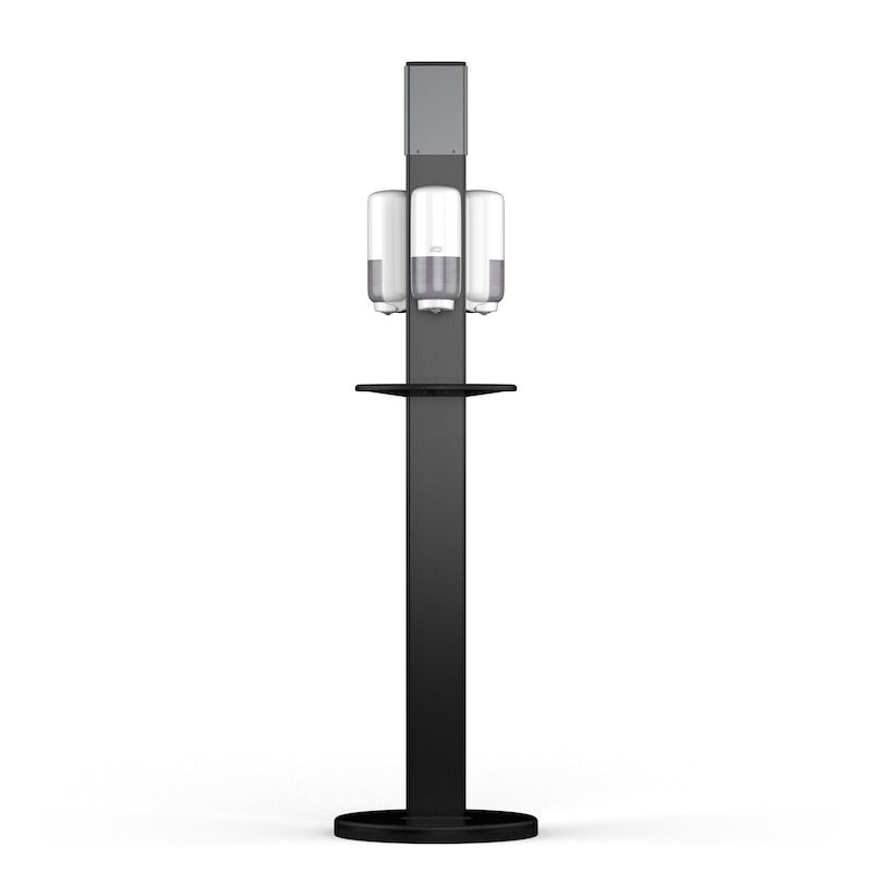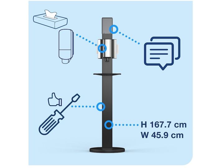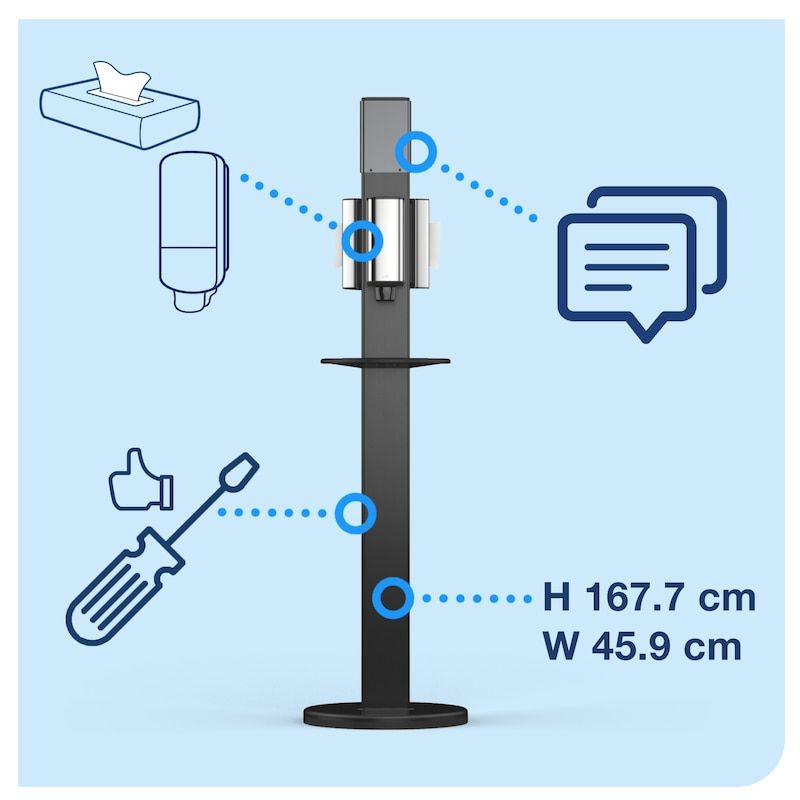 Tork Gulvstander er med til at forbedre hygiejnen i kontormiljøer og andre offentlige steder med hånddesinficering og servietter lige ved hånden for medarbejdere, gæster og kunder. Standeren hjælper både med at minde dem om vigtigheden af god håndhygiejne og at vise dem, at du tænker på deres trivsel.