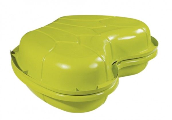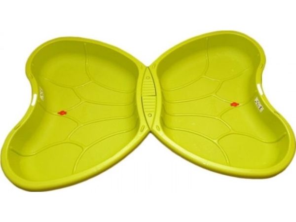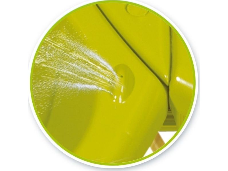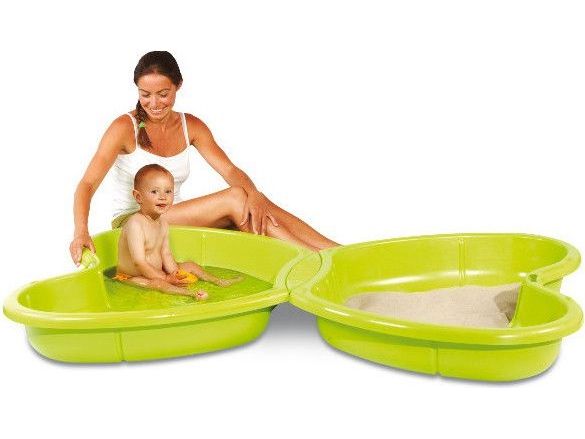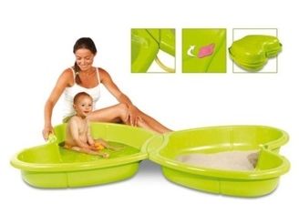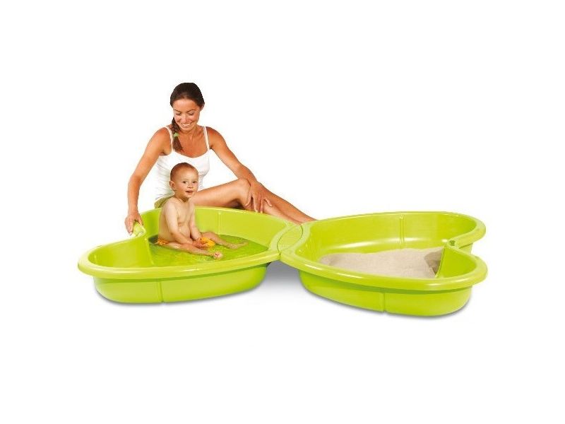 Sandpit with two parts easy to link together. One can be filled with sand and the other with water. Water sprinkler on the middle to have the possibility to connect to any regular garden hose (not included). A drain plug allows to quickly and easily empty the water cavity.