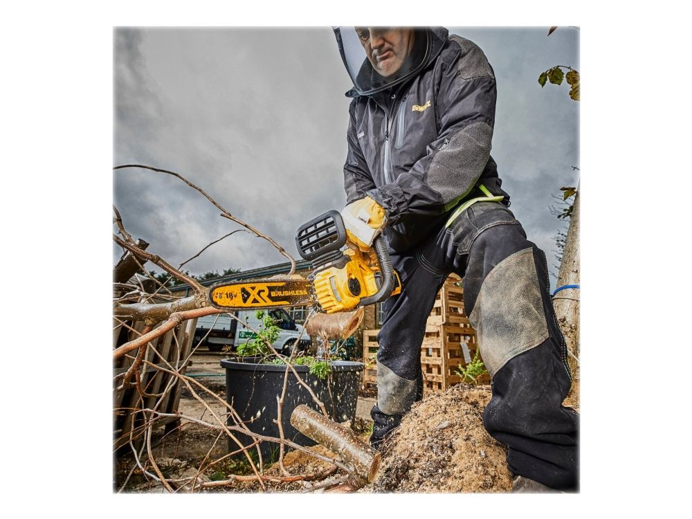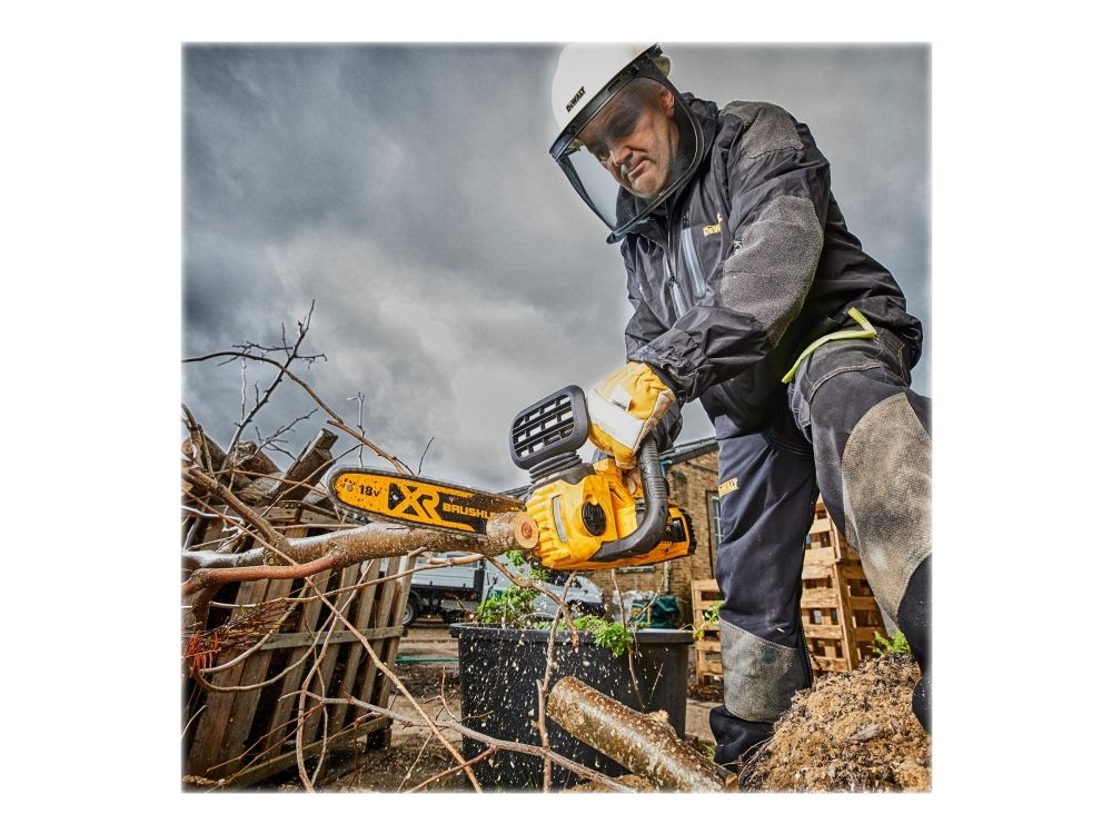 - 30cm Oregon Bar and Chain - High Efficiency Brushless Motor - Delivers up to (70) 4x4” cuts per charge (18V, 5Ah) - Automatic Oiling - Reduced Maintenance - Tool Free Bar fitment & Chain Tensioning - Fast Chain Adjustments - Variable Speed Trigger - No pull starting and improved control during cutting - Chain Speed - 7.68 m/s - Extensive over-mold, for extra grip and comfort in prolonged use - Supplied with 1 x 18V, 5.0Ah Battery + 1A Charger