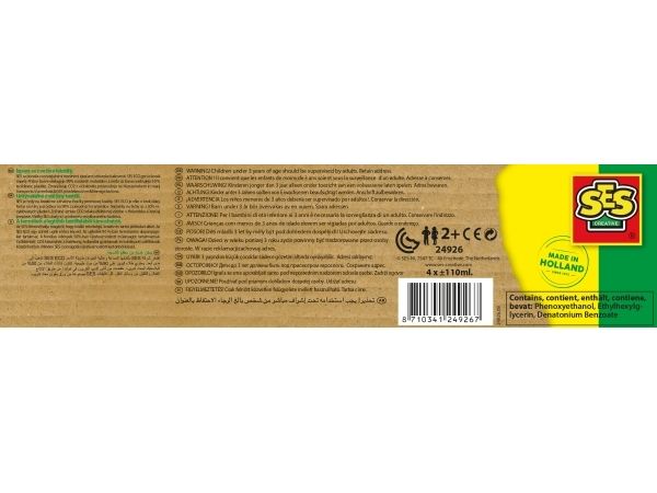 Introduce your child to the environmentally-friendly way to play! ECO products are made with a high percentage of natural resources and use recycled plastic. This fantastic set of fingerpaints is a great way of encouraging your child’s creativity while allowing some time for messy play! Easy to clean up, these paints are super-washable, non-toxic and completely safe for children. In four bright colours, see what masterpieces your child will create! SES has been the specialist in creative toys for more than 40 years. We develop and produce a complete range of creative toys. Child development is the central concept in the development of our products. As development is important during the early years, it is important that a child has the opportunity to develop his or her talents and to use their creativity. Besides developing creativity, safety and quality are the most important aspects of all our products! Each year, this expertise is enjoyed by more than 14 million satisfied consumers in 70 countries. The products we develop are essential to the different developmental stages of any child.