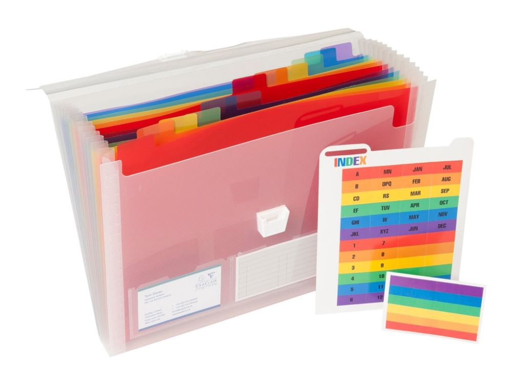 The Exacompta Expanding case is made from 0.7mm clear polypropylene. 33x25cm in size and has brightly coloured pp dividers. The file has an expanding spine and a press stud closure. Customizable tabs Capacity 400 Sheets The file has 13 sections