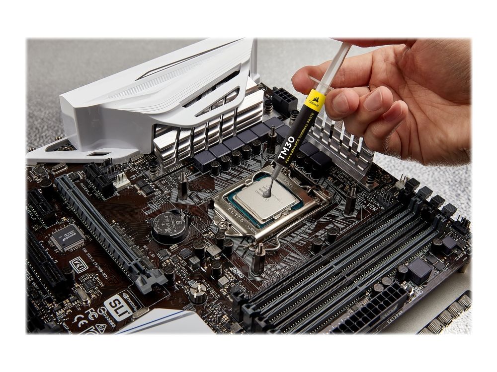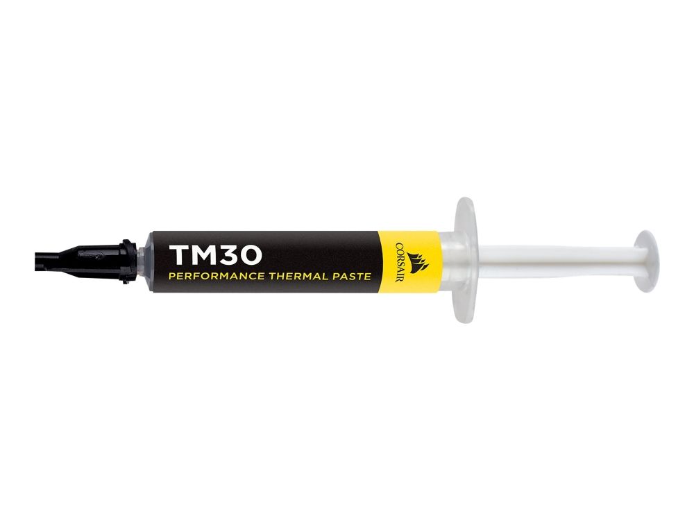 CORSAIR TM30 thermal paste helps you push your PC to its limit, with a low-viscosity zinc oxide thermal material that's easy to apply. TM30's ultra-low thermal impedance ensures high-efficiency heat transfer between your hardware and cooler, lowering temperatures and allowing for higher clock speeds. Each syringe contains enough TM30 for multiple standard CPU applications, and once installed, TM30 lasts for years with no drying, cracking or thermal degradation. Whether you use liquid or air cooling, CORSAIR TM30 thermal paste is ready to keep your PC cool under pressure and handle the hottest CPUs and GPUs with ease.