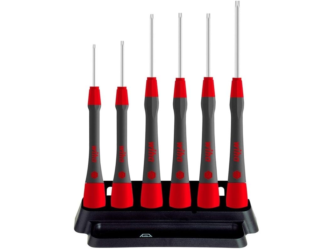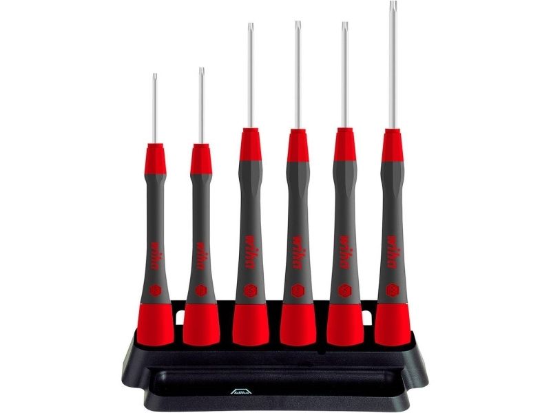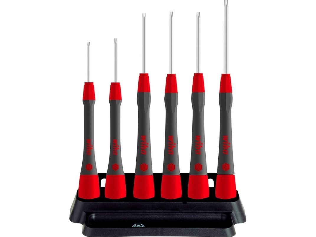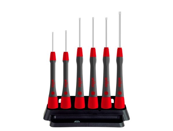 The challenge in precision screw fastenings is to work meticulously and carefully without damaging the work piece. Thanks to their long, slim handles and quick-turning zone, Wiha PicoFinish® fine screwdrivers are ideal for delicate and high-precision tasks in precision mechanics as well as for hobbyists and model building. Its ergonomic handle design with a soft zone makes it comfortable to use. The smooth-running rotating cap allows users to turn the screwdriver quickly and sensitively. The printed screwdriver symbols on the rotating cap make it easier to select the right screwdriver profile. The hexagonal ball end enables users to fasten and unfasten effortlessly at an angle of up to 25°. The set contains 6 PicoFinish® fine screwdrivers and a holder. The holder can be used to neatly store the fine screwdrivers at workstations.