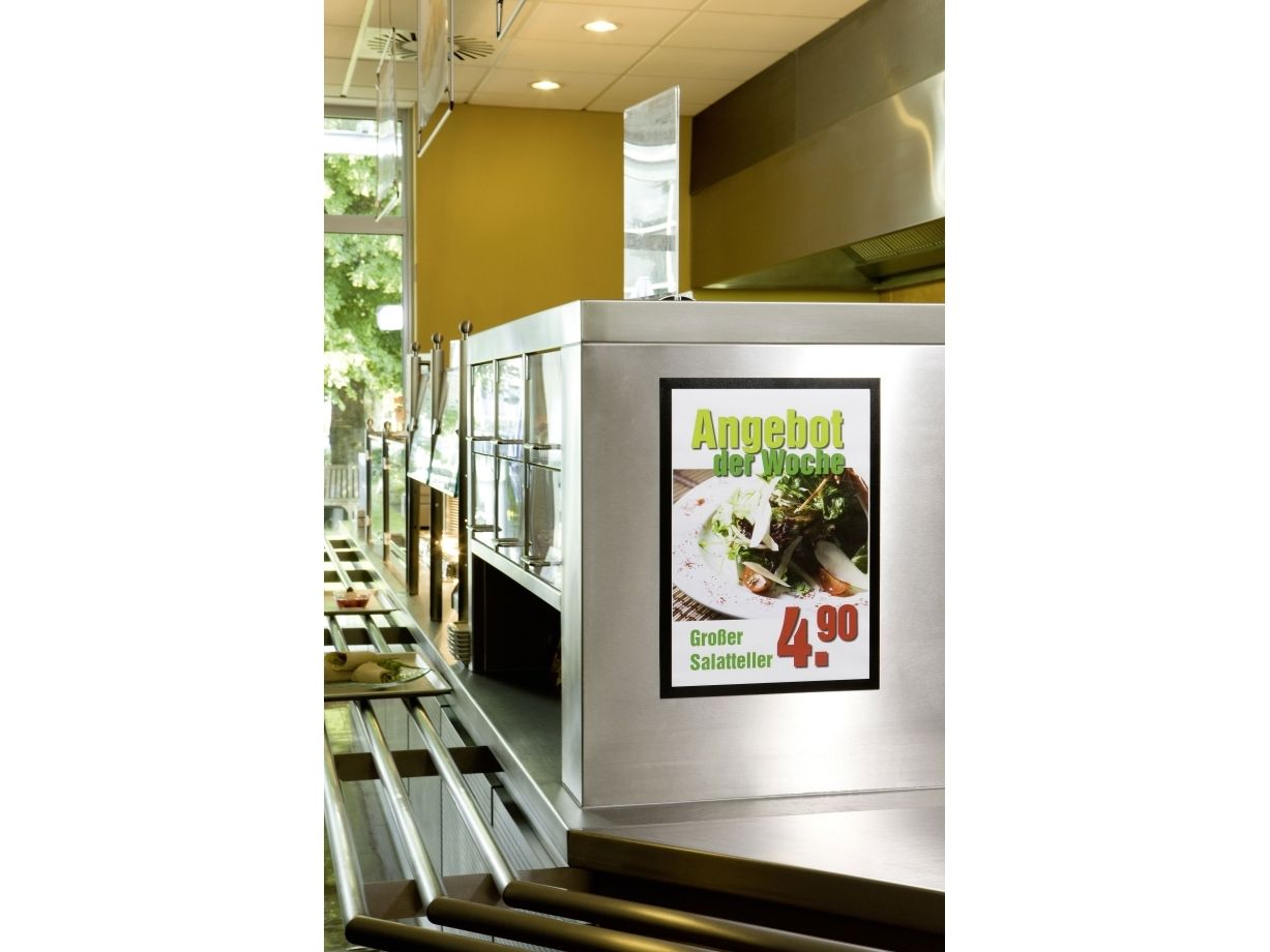 - Presenting information in a high quality and professional way - Quick insertion and exchange of documents via a fold-back magnetic frame - Easy to attach to solid and smooth surfaces; can be removed from glass - Areas of application: for documents such as orientation, room identification or offers etc.. - When applied to glass, information can be read from both sides. - Frame looks identical from both sides - For use in portrait and landscape formats - External dimensions: 325 x 425 mm