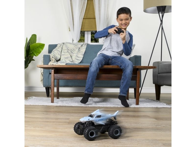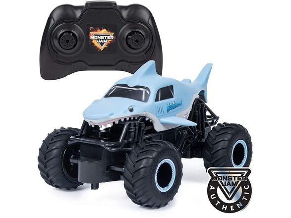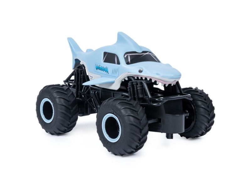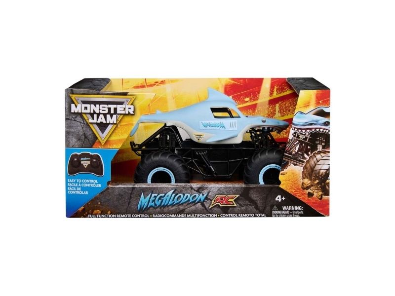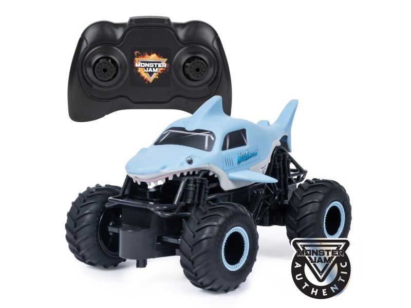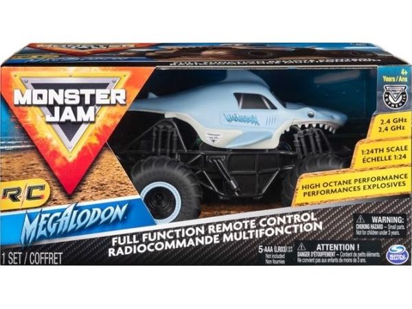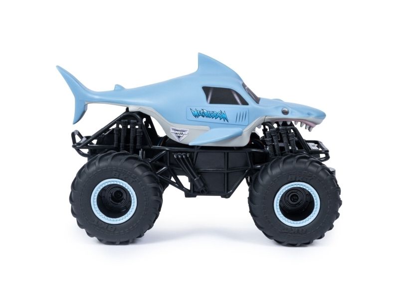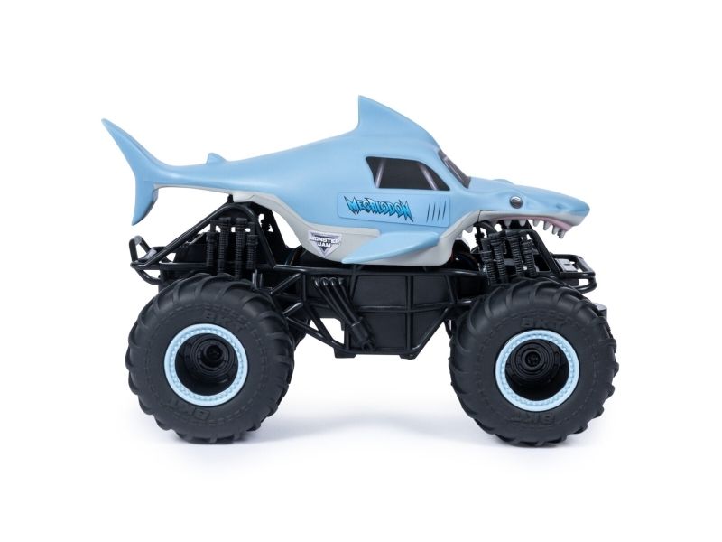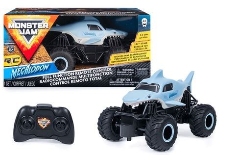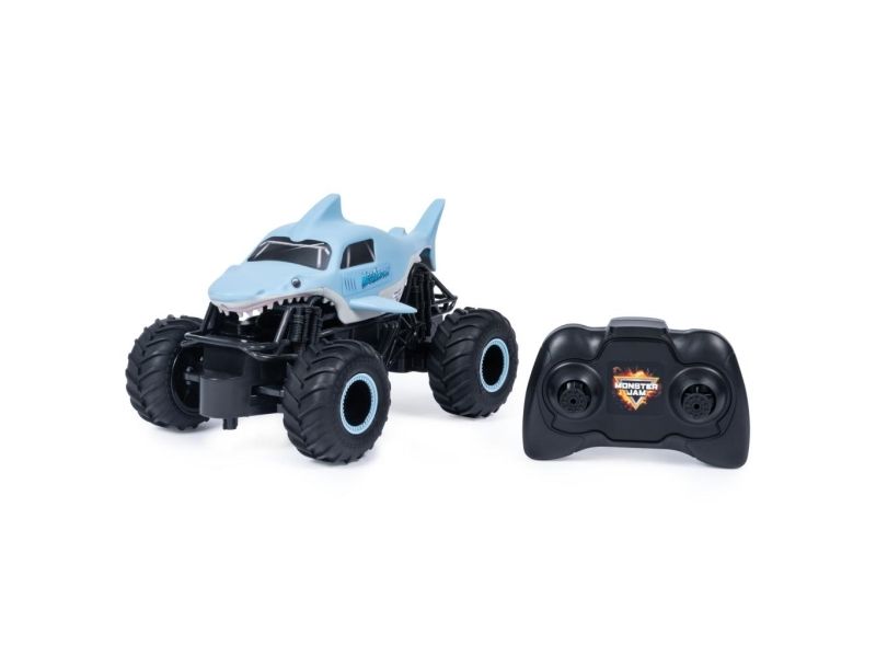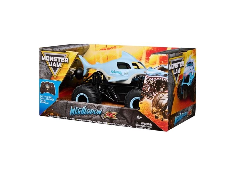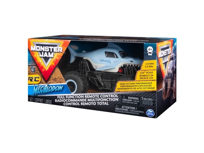 From the depths of the prehistoric ocean rises the all-new, official Monster Jam 1:24 scale Megalodon RC! This powerful predator lashes about to perform epic stunts, crazy crashes and brutal bashes! Featuring 2.4 GHz, you can race up to 6 Monster Jam trucks at a time! Now it’s even easier to host your own high-flying Monster Jam rally with your friends! And with a range of up to 250 ft., this prehistoric shark can travel farther in search of puny prey to pulverize! Nothing will stop it from dominating the Monster Jam circuit! Authentically styled, this 1:24 scale Megalodon remote control comes with official BKT Tires and a look-alike chassis, making sure this giant shark always delivers big fun! The all-new Megalodon RC is like driving the real thing! Catch this prehistoric beast and perform high-flying, gravity defying stunts like big air, donuts, cyclones and more! You’ve never been this close to the Monster Jam action than with the all-new, official Monster Jam 1:24 scale Megalodon RC!