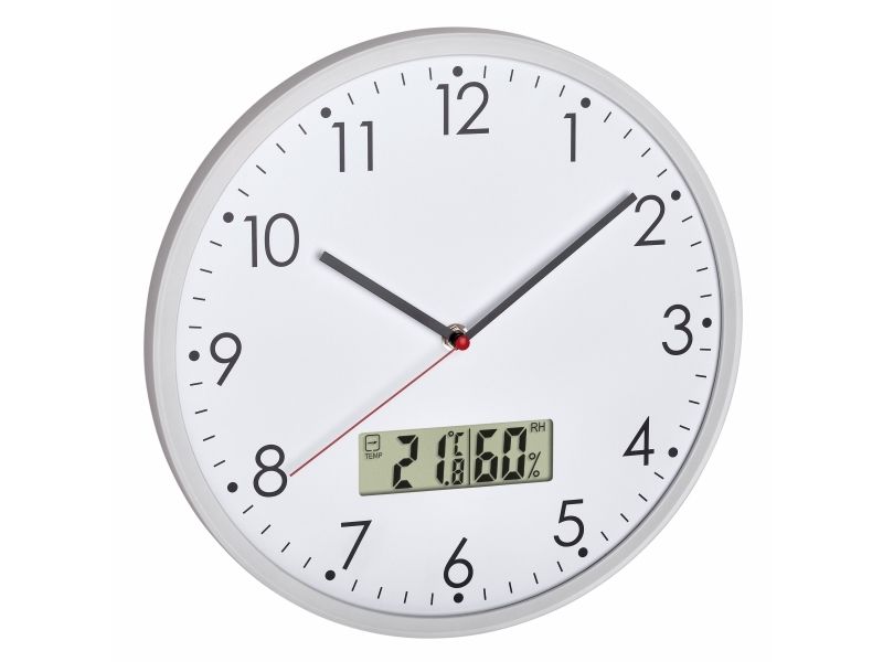 Whether it’s the living room or the office, this simple wall clock blends harmoniously into any environment. The narrow frame and the classic dial give a timeless touch. The clock has a high-quality, real glass cover. An integrated display shows the temperature and humidity. This keeps the room climate in view. The clock and the thermo-hygrometer work independently.