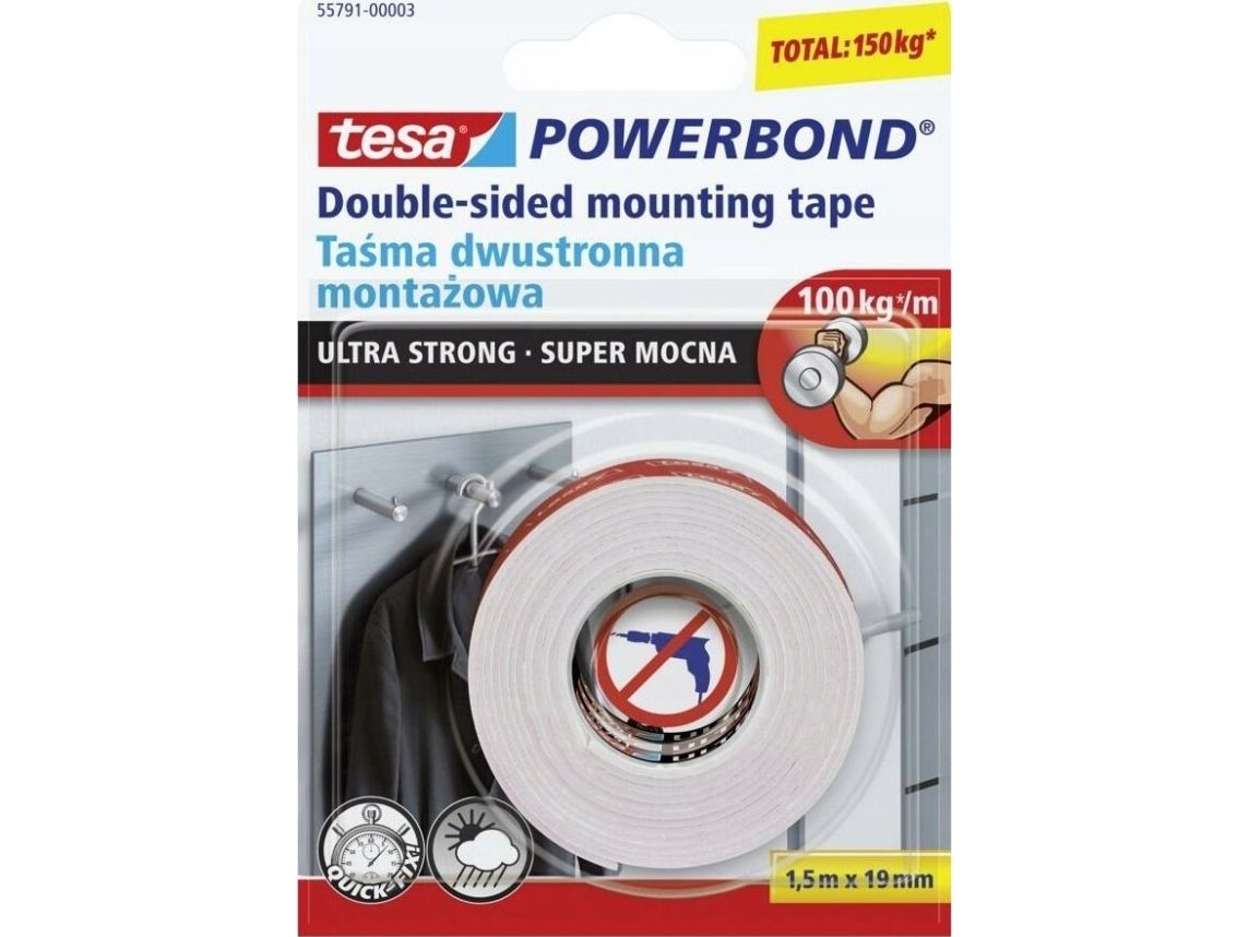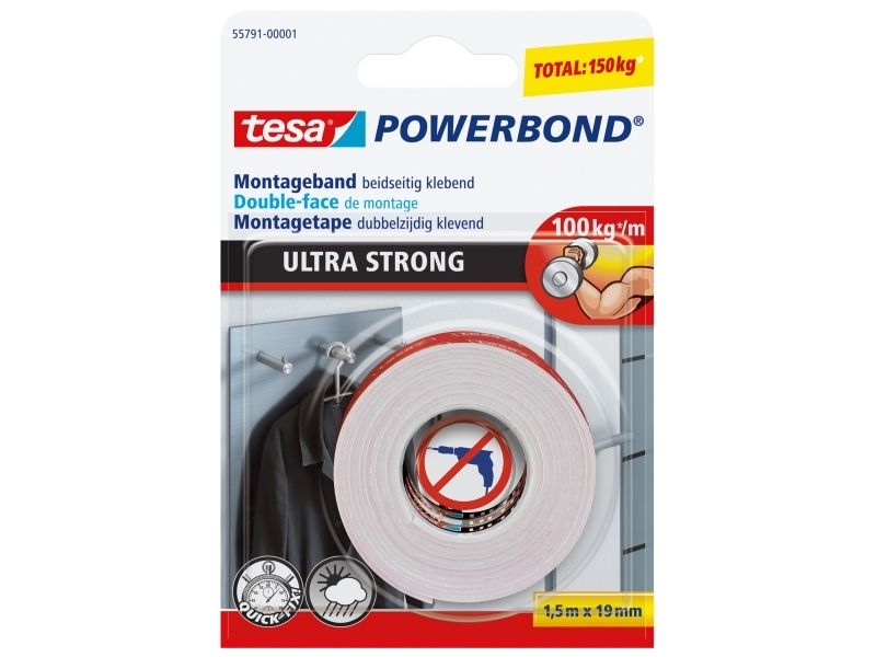 tesa Powerbond ULTRA STRONG is our strongest double-sided tape. Specially made to give an extra strong and secure hold on solid surfaces like tiles, metal and most plastics - even minor surface irregularities aren't a problem as the tape compensates. Ideal for permanently mounting objects of up to 10 mm thick with weights of up to 6 kg per object, with no need for a hammer or a drill. Capable of holding up to 10 kg per 10 cm of tape when conditions are optimal. A durable and reliable hold, easily.
