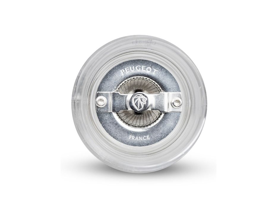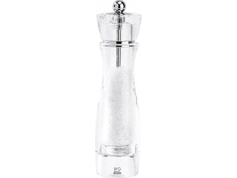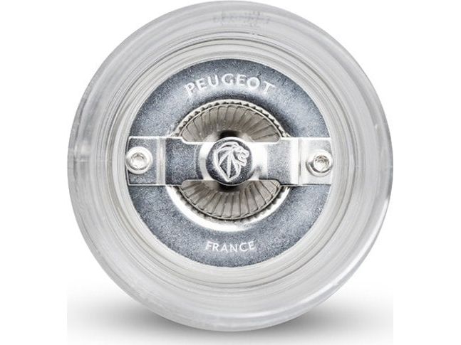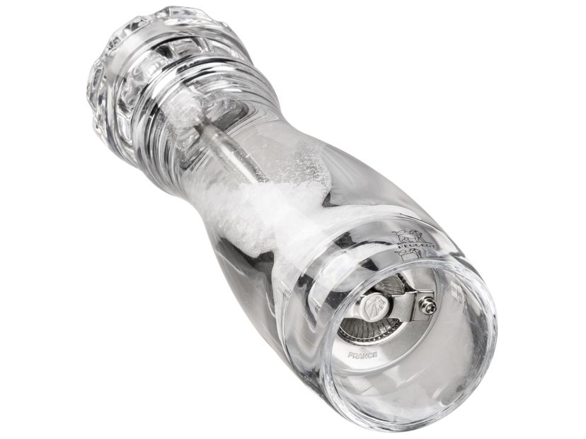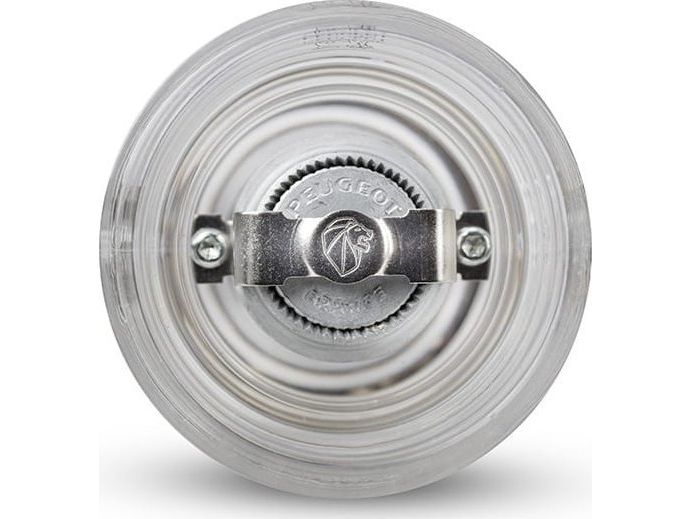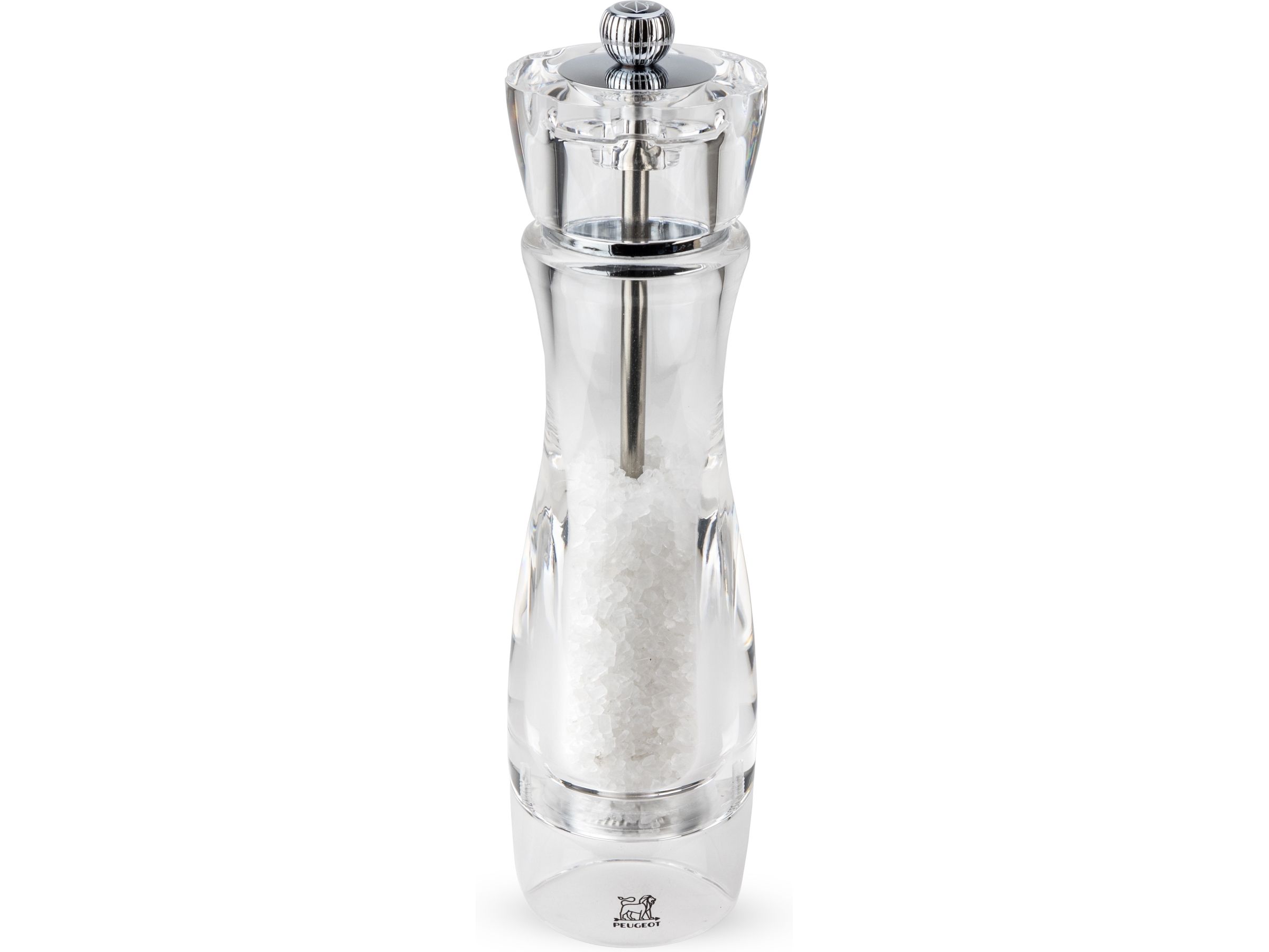 Clear acrylic combined with shiny metal Completely transparent with a beautiful slender silhouette, the Vittel salt mill shows the salt crystals that it holds, and allows you to see how full it is. This mill is equipped with the Peugeot steel mechanism, which comes with a lifetime guarantee. It gives you the option of adjusting the grind size, using the knob at the top (tighten the knob for a finer grind). This Vittel mill will be a great addition to beautiful contemporary tables.